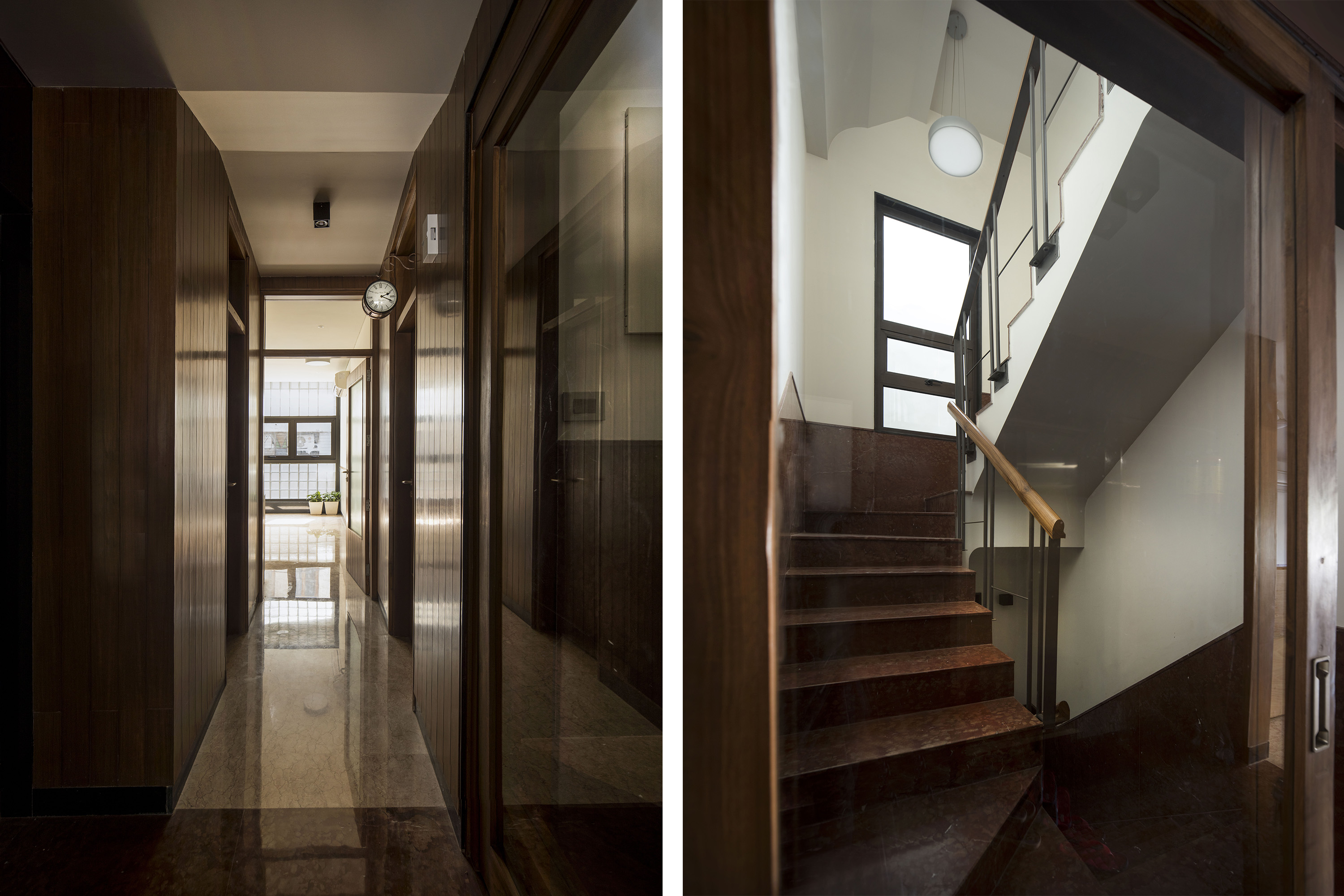 Each space has a distinct identity despite having a common palette of materiality including marble, wood, glass blocks, steel & hues of paint. The furniture scheme was curated in association with Differniture and was made of reclaimed wood, thereby keeping the strain of sustainability alive in the project.
