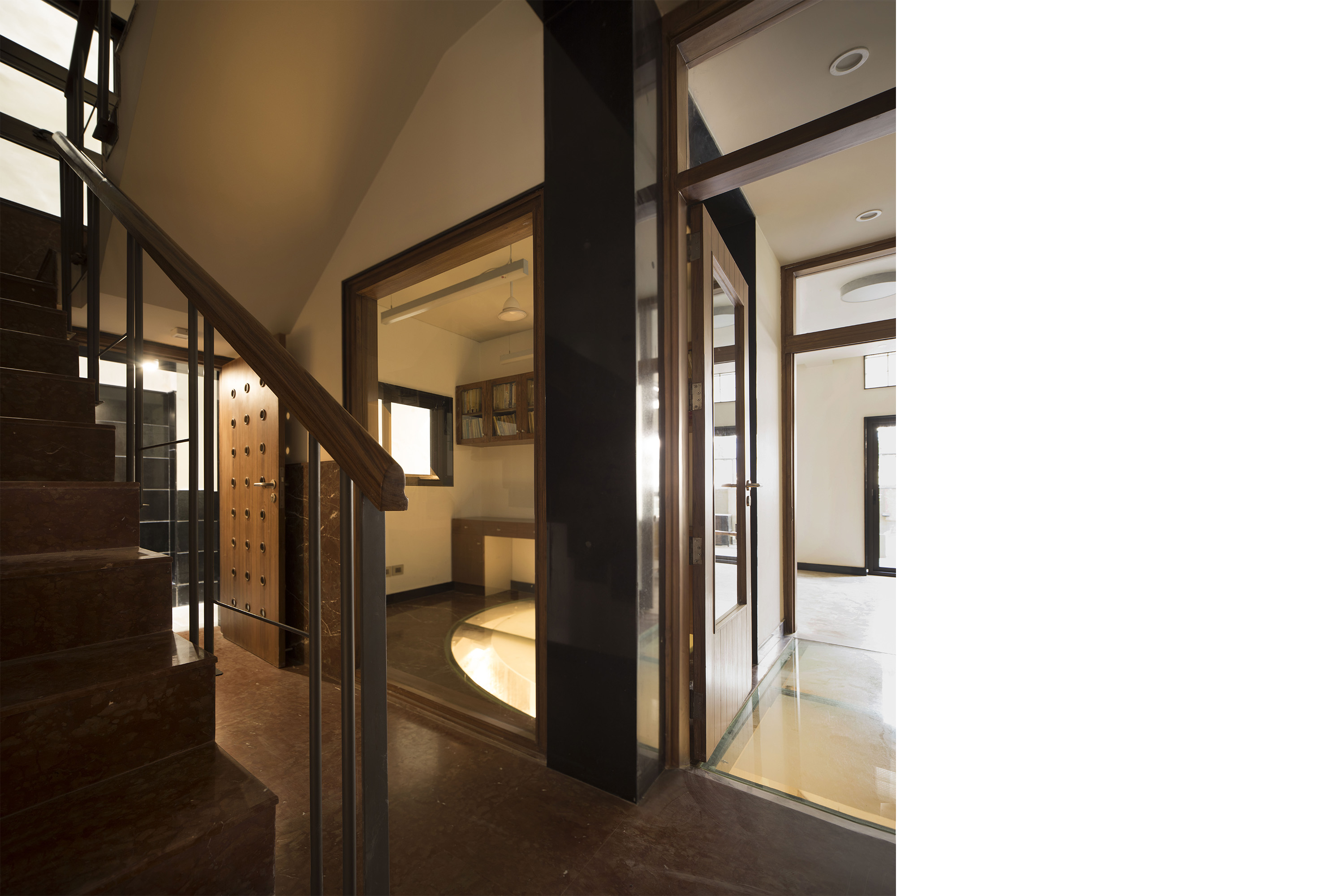 On the site existed a dried-up water well & its discovery was the conceptual impetus for the project. A vertical axis was set up that originated in the well & concluded in a lightbox at the terrace level. This axis was visualised as a metaphorical link between the Sun & Earth in the built form.