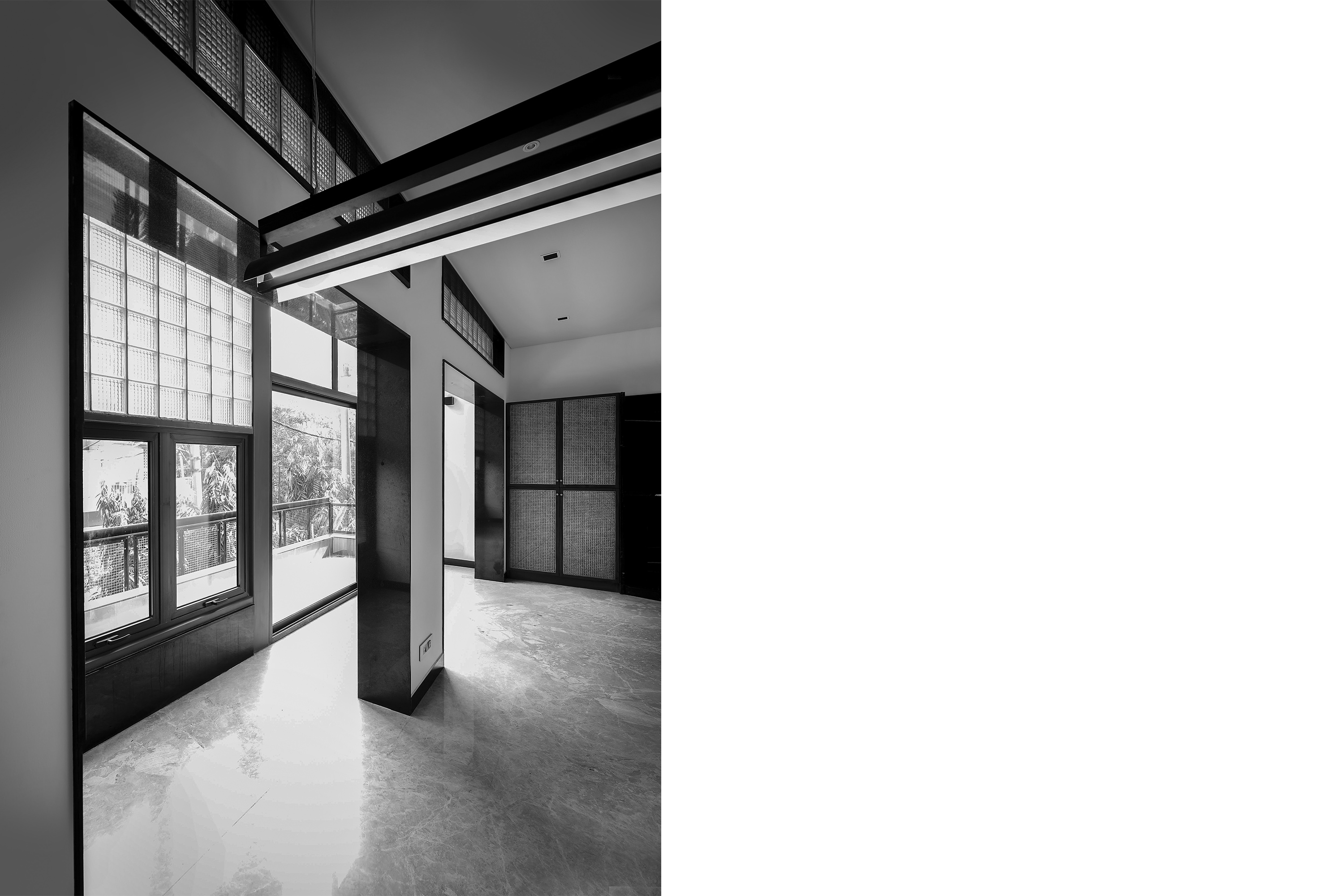 The façade became an assembly of varied elements layered strategically to create the sense of that of an expanded threshold. The façade system was composed of aluminium glazing systems, glass blocks, masonry & steel mesh, all held up by a structural steel frame. The space as a whole became permeable while interacting with a multi-stranded façade.