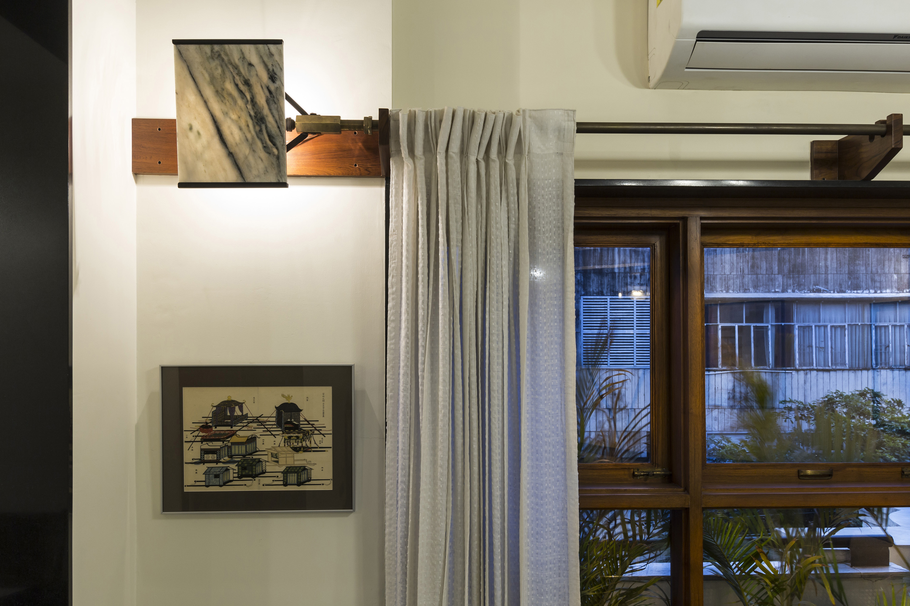 The renovation of this 25-year-old apartment entailed the re-arrangement of spaces, which includes a living room, a dining room, a kitchen accessed through a central atrium. The gradient of light that enters through the fenestrations on the eastern façade is punctuated by the rectangular atrium around which all the spaces are arranged. In a clockwise manner, one enters from the north; towards the east is the living room, dining room on the south and the remainder of the dwelling in the west. The kitchen being in the south-east corner, a diagonal was cut to access the same. The atrium is the point of arrival, which is mostly illuminated from the top light as an additional source of daylight.
