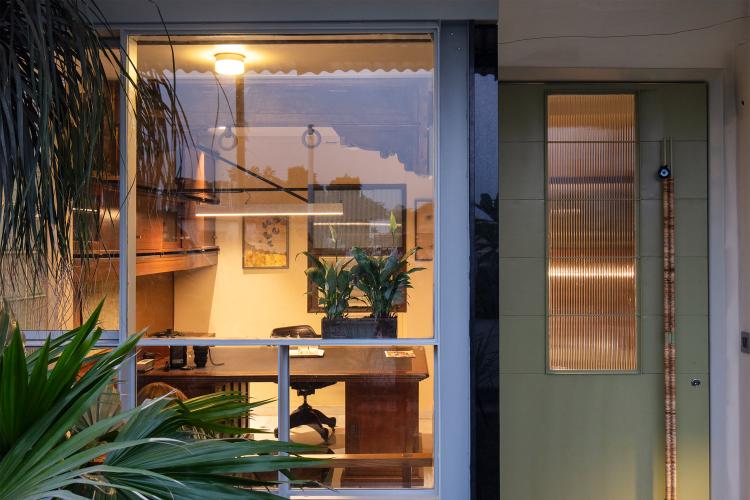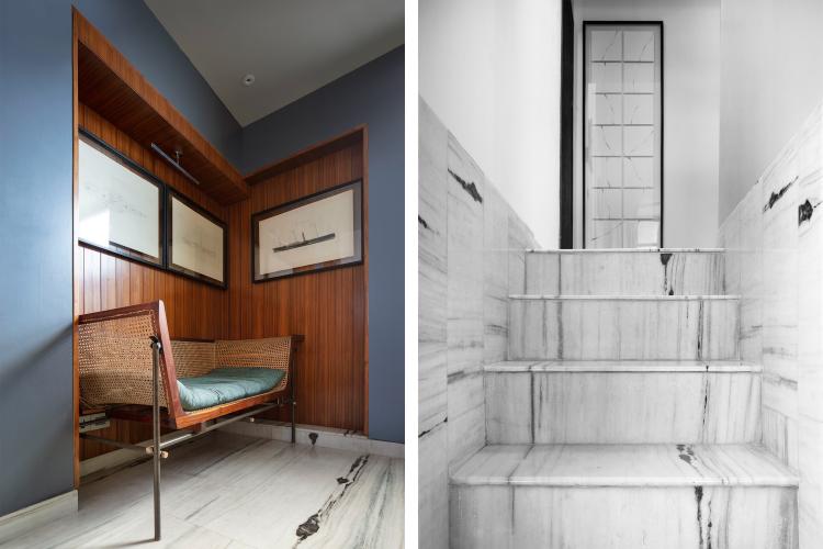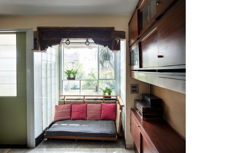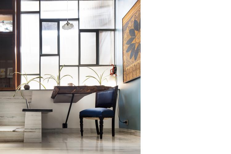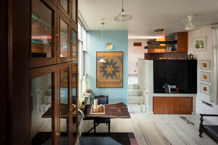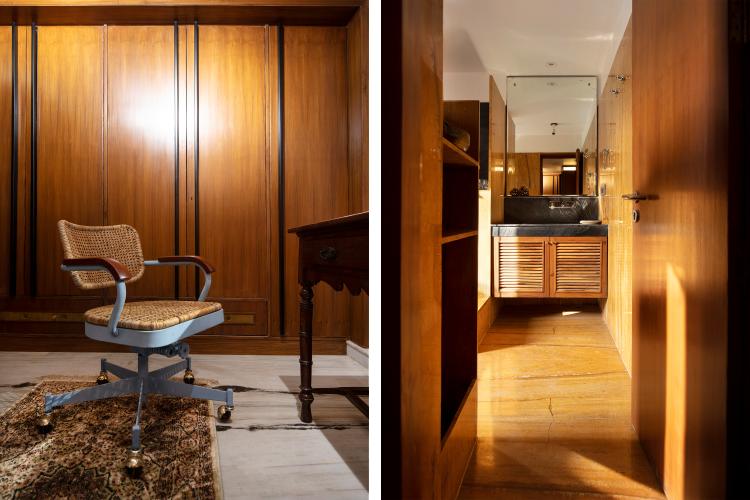 The private bedroom and walk-in closet are nestled in the rear of the layout and have been accentuated with elements that instil a sense of repose and comfort in the space. Heirloom furniture, books, memorabilia and art add an emotional and visual facet in the curation of the home's design identity that transcends across various styles and time periods. The core essence of the project lies in the ingenuity of the materials used and the design process that did away with the employment of a singular stylistic grammar, allowing the apartment to take shape in accordance with the needs of the home owners; to finally result in a space which allows them to revel in each other's company.