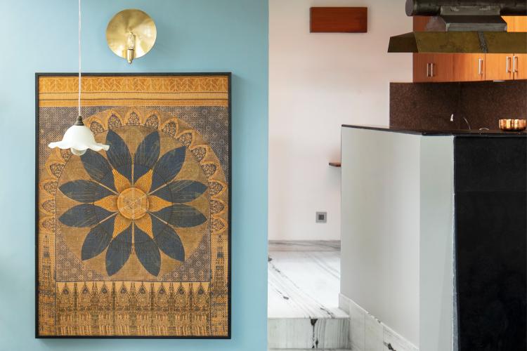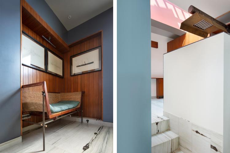 Colours that render the selected walls of the interiors change as one moves through the varying zones of the home, which has been further layered using art and vintage bric-a-brac. The library overlooking the lush terrace garden welcomes one into the premises of the apartment. A short flight of steps leads one into the living room and dining nook. The Nordic tapestry against these a blue wall, custom cantilevered rosewood dining table and the vintage cane mesh furniture in the living area makes for a great segue into the design narrative of the residence. A compact set of stairs culminate in the raised open kitchen that has been embellished with a custom fabricated brass chimney and a strategically placed skylight that fills the space with a warm luminance all day long.