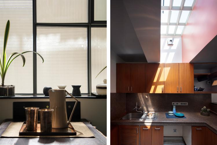 The interiors have been conceived & visualized as a landscape of form & function, juxtaposing geometric & organic forms that complement each other. Through the flesh of the entire space, light & colour play an integral role in stringing together the aura of the residence. Additional windows were included in the framework of the space to amplify the influx of sunlight entering the apartment through the eastern & southern facades. Northern facade apertures invite diffused light into the space with the inclusion of a skylight to catch glimpses of the moon in the night sky. Changing shadows and warm illumination through the day bestow the apartment with an airy and light spirit.