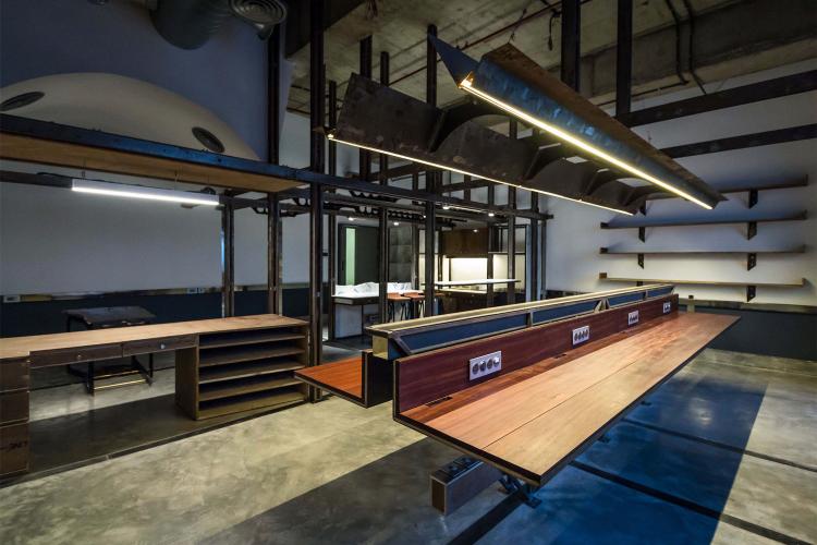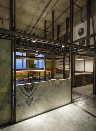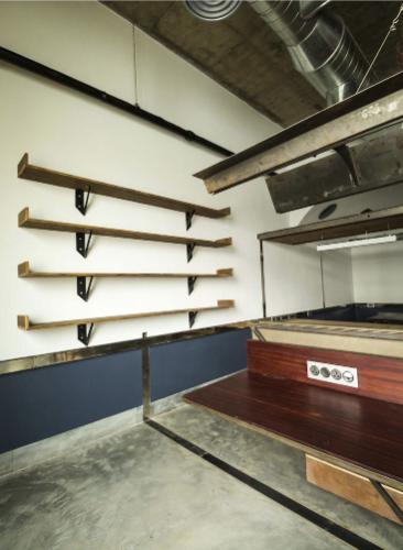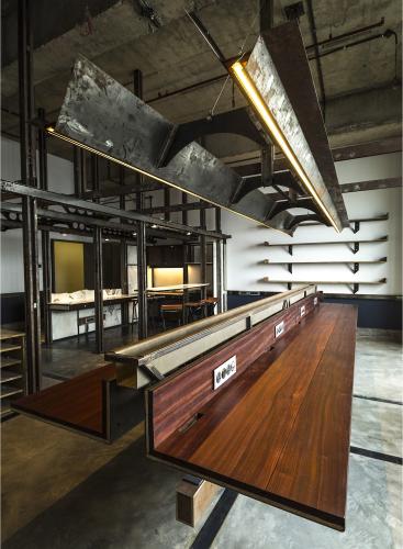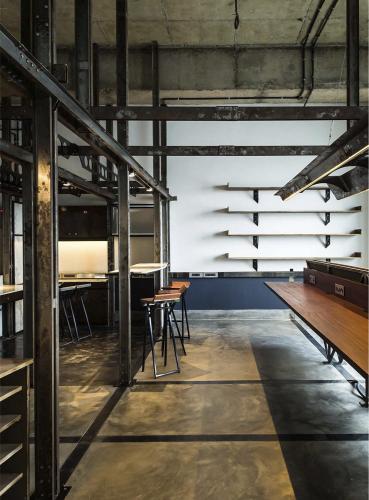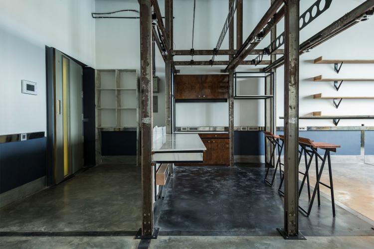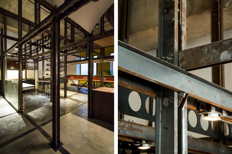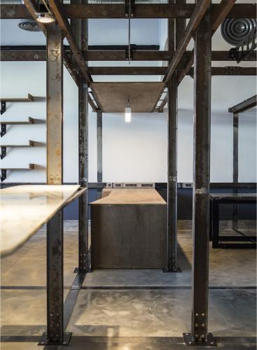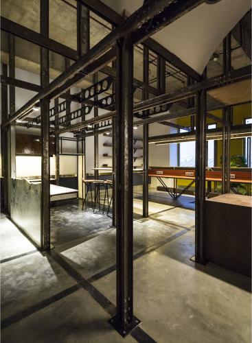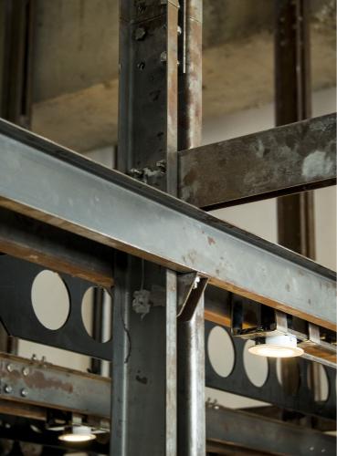 1つ目のレイヤーは、フレキシブルなフレームとして機能するインフラストラクチャーの挿入である。このフレームは空間内に組み込まれる機能/アクティビティを統制するグリッドとして機能する。立体的に組上げやすいように、主にCチャンネルの組合せでフレームを構成した。鉄骨の断面形状を活かして電気設備を備えるとともに、他のオブジェクトを機能に応じて容易に取り外しが可能な、フレキシビリティの高いシステムとして計画した。