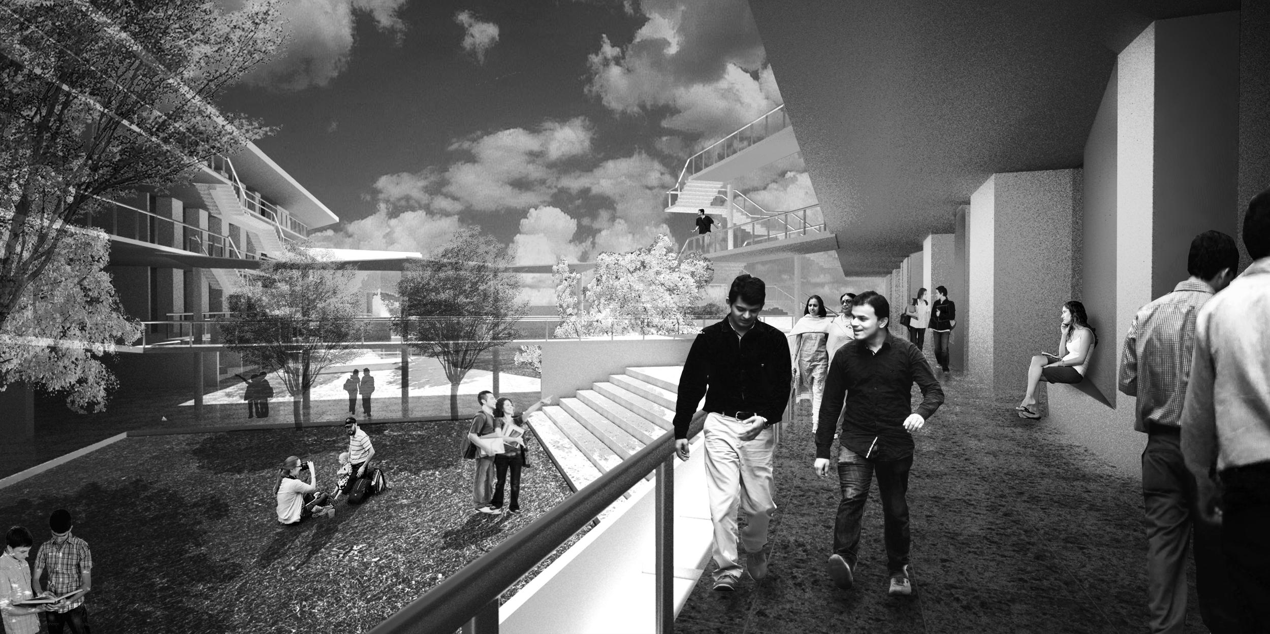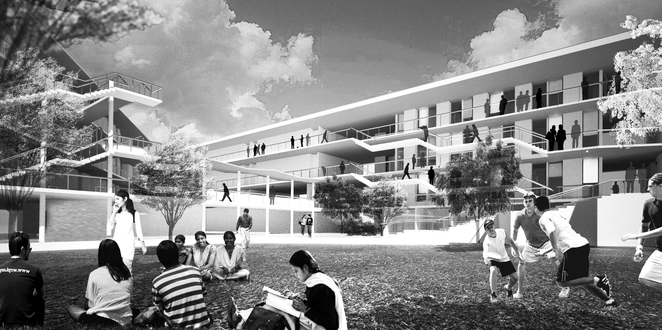 Single-loaded corridors unfold into gardens & play a pivotal role in activating various zones that have been connected using bridges & staircases across the volume of the built mass. Balconies, terraces & niches act as break-out spaces where the students & staff members can unwind & interact through the course of the day, hence shaping the auxiliary areas into a social arena of sorts.