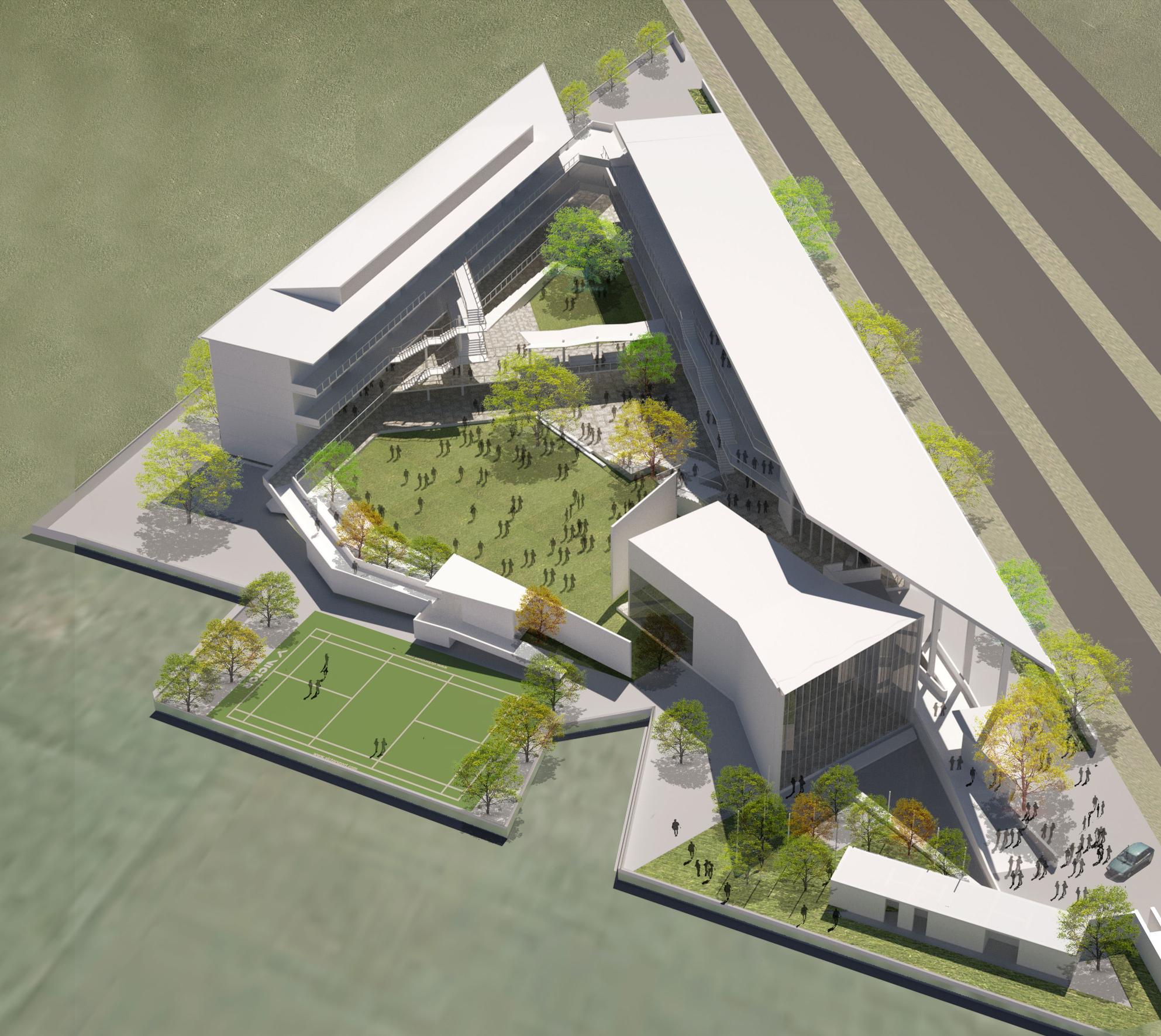 The campus has been constructed upon a peculiarly shaped plot abutting the highway, allowing the architects to mould the final form into a versatile ensemble of spaces. The layout of the masterplan has been envisioned as an oasis where the programmatic functions look into the landscaped campus grounds, which are the heart of the space. The minimal design scheme allows rectilinear & angular forms to take precedence in the construct of the campus.