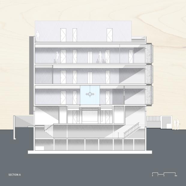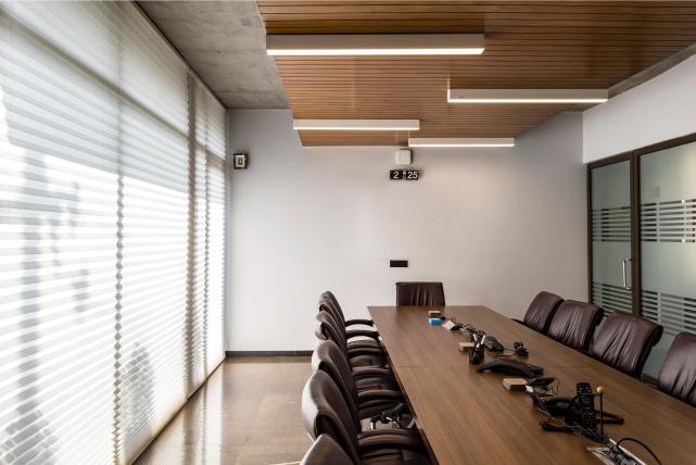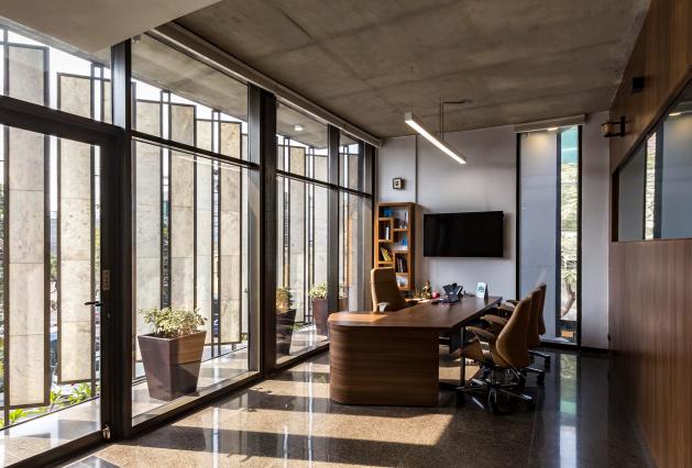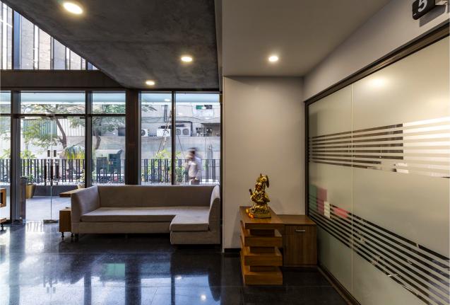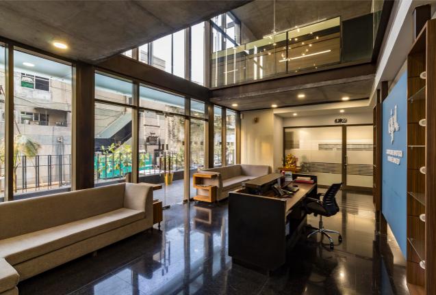 The program primarily includes an operations unit, supply wing & basement storage utility. The interior layout of the built form was synthesized on the basis of a systematic building diagram. The G+4 structure composed of an area of 10,000 sq. ft houses the core functional niches of the office space with a dash of chic grandeur in its weave. The matrix of functions through the office includes core workspaces, meeting rooms, a double-height reception area which acts as an internal sanctuary, official cabins & a cafeteria.