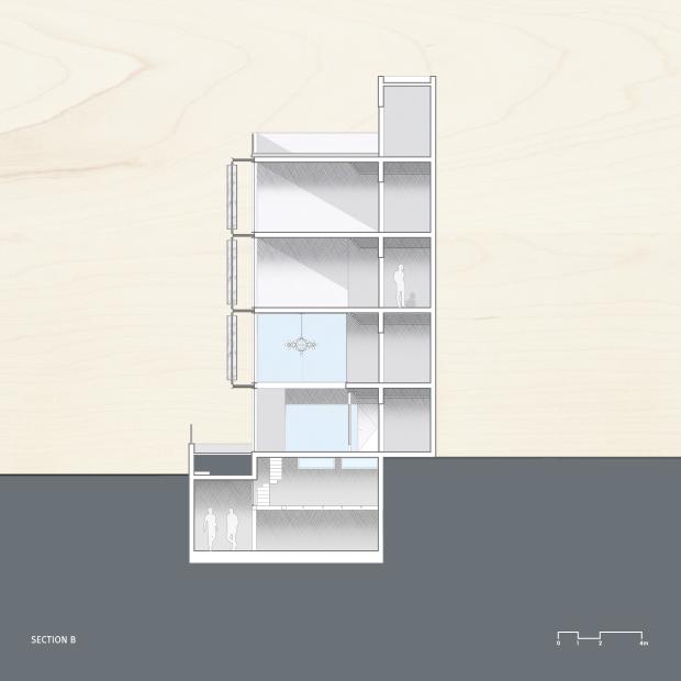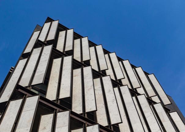 南西からの強烈な太陽光と熱を考慮し、ファサードには6㎜厚のグワーリヤル産砂岩のスクリーンを設け、明るく開放的な空間を実現しつつ日射遮蔽に配慮したデザインとした。また、外装はノイダ産の黒御影石で覆われており、周囲を取り囲む荒涼とした工業建築とは一線を画した、自然素材による温かみのある外観を目指した。