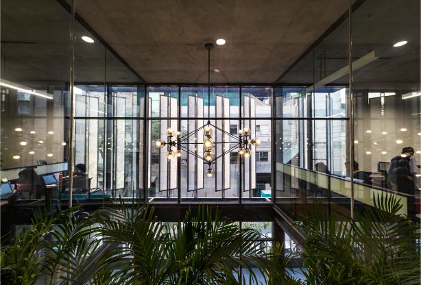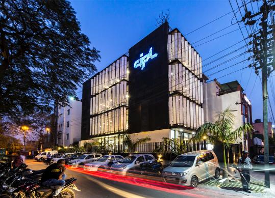 The built form is a modernistic take on corporate design, rejuvenated with the charm of elements unique to the ensemble & its execution.