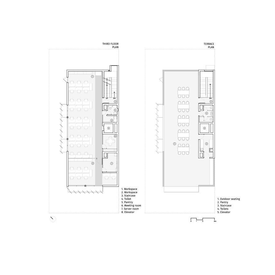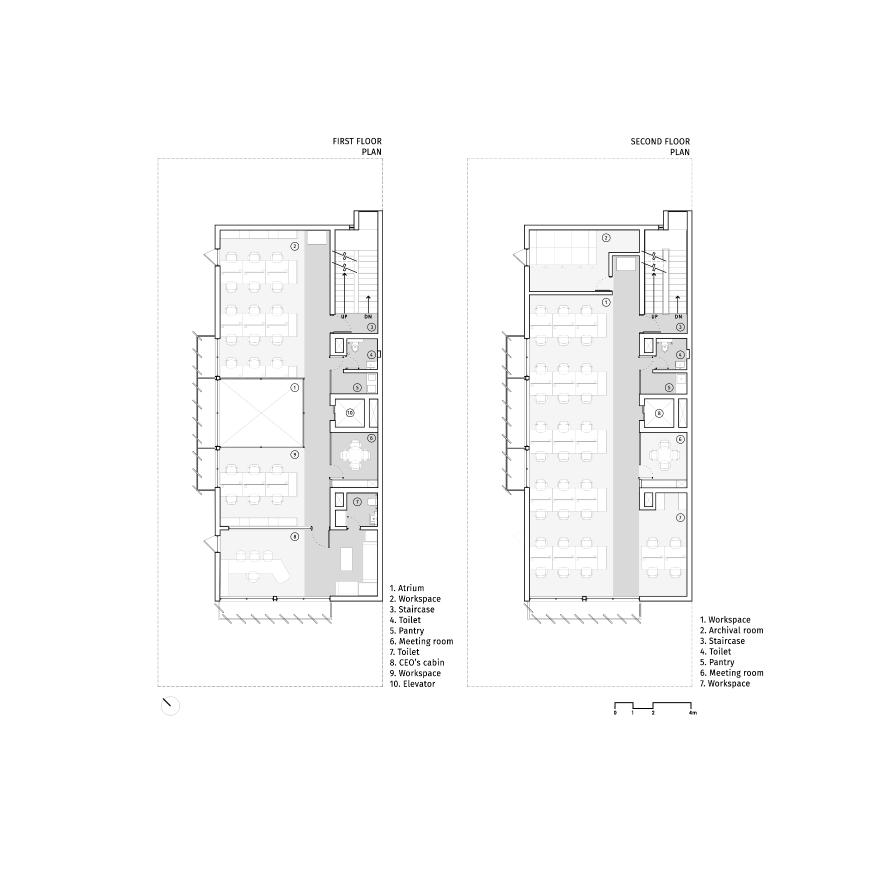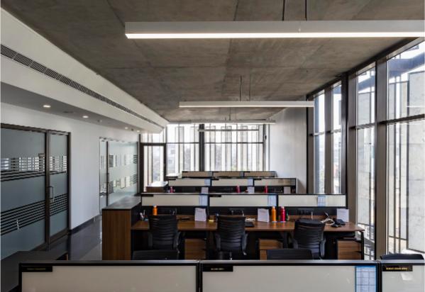 デリー近郊の産業都市ノイダに計画されたIT企業のオフィス。機能的かつ様々なワークスタイルに対応可能な柔軟性を追求した。平面計画は、2つの平行するストライプ型とし、1つはサービス、もう一方はワークスペースとし、ワークフローをより効率的にするシンプルな構成とした。