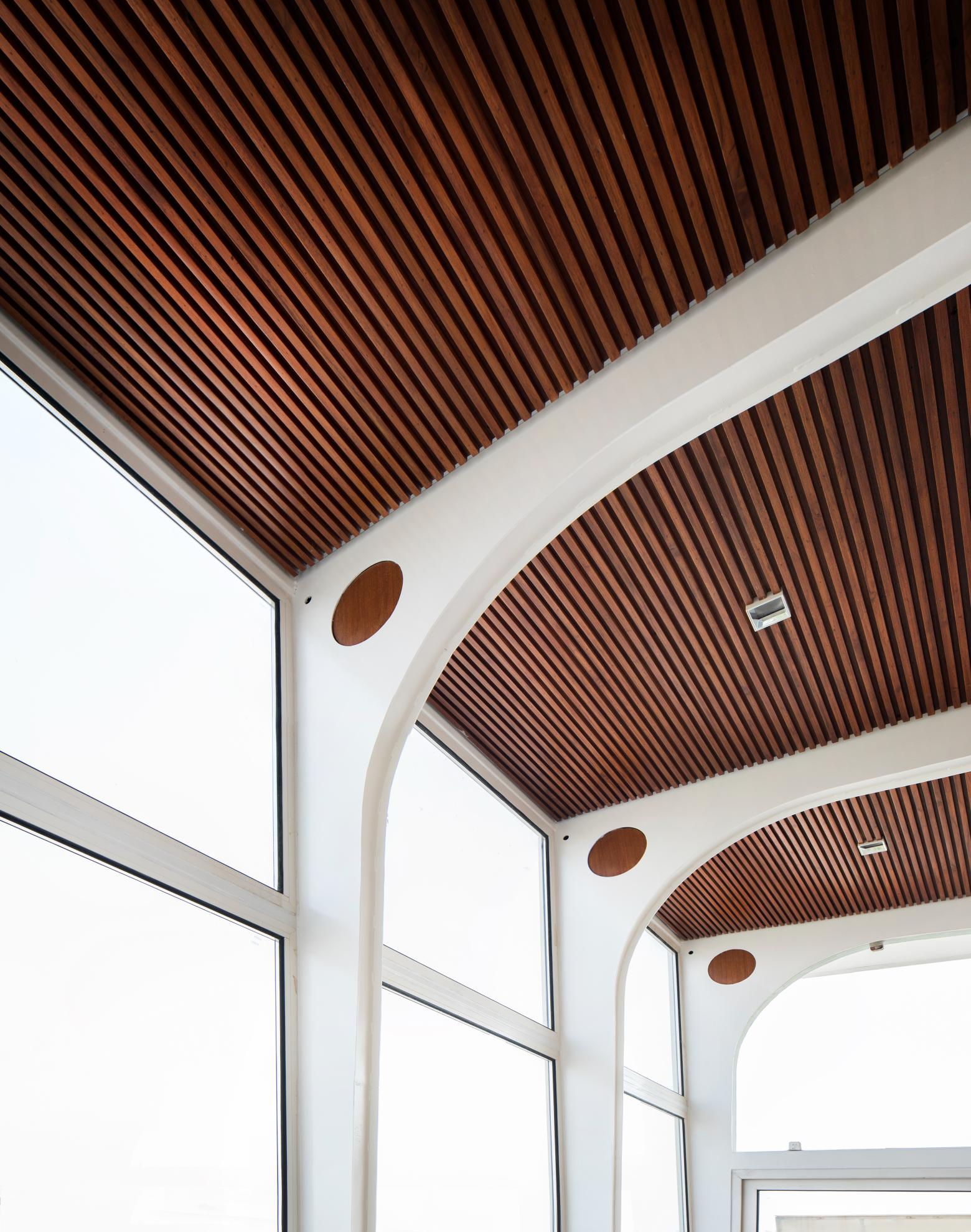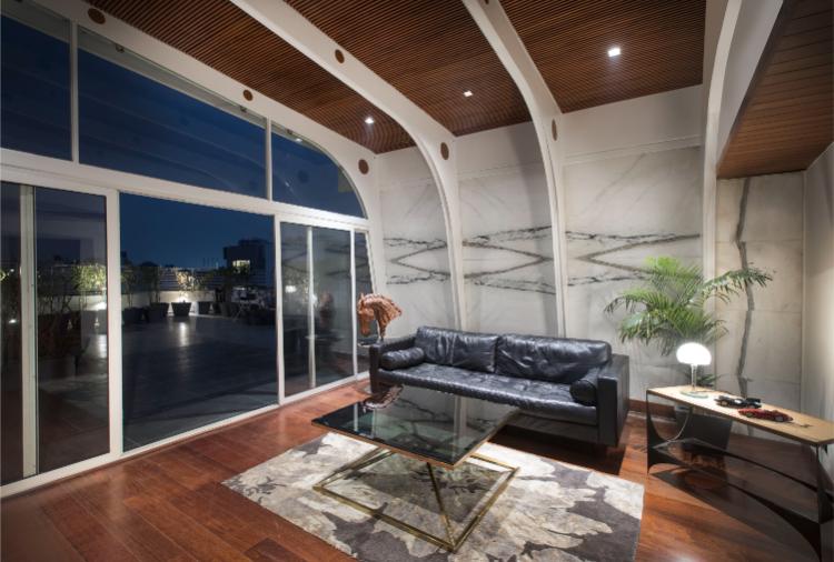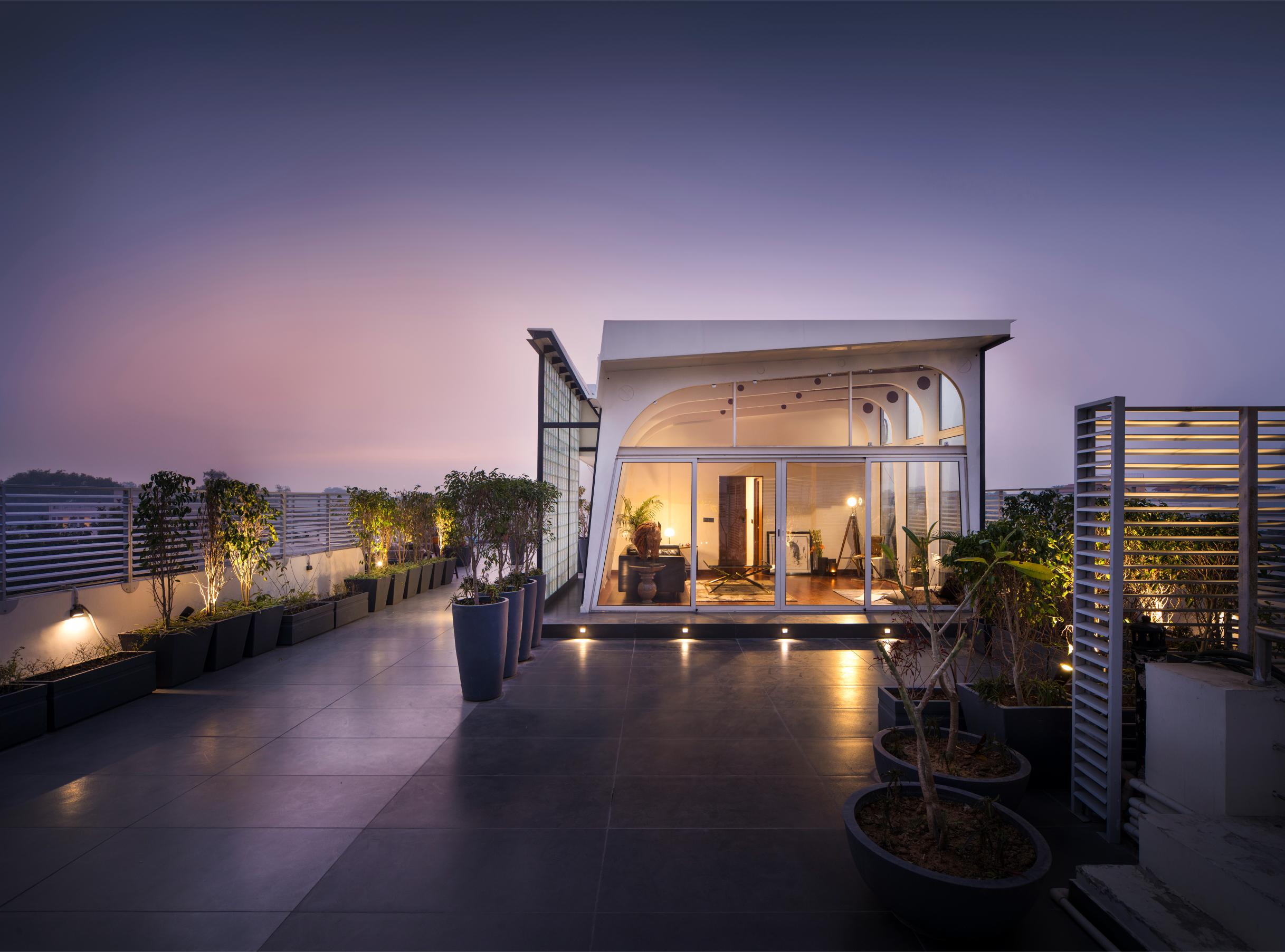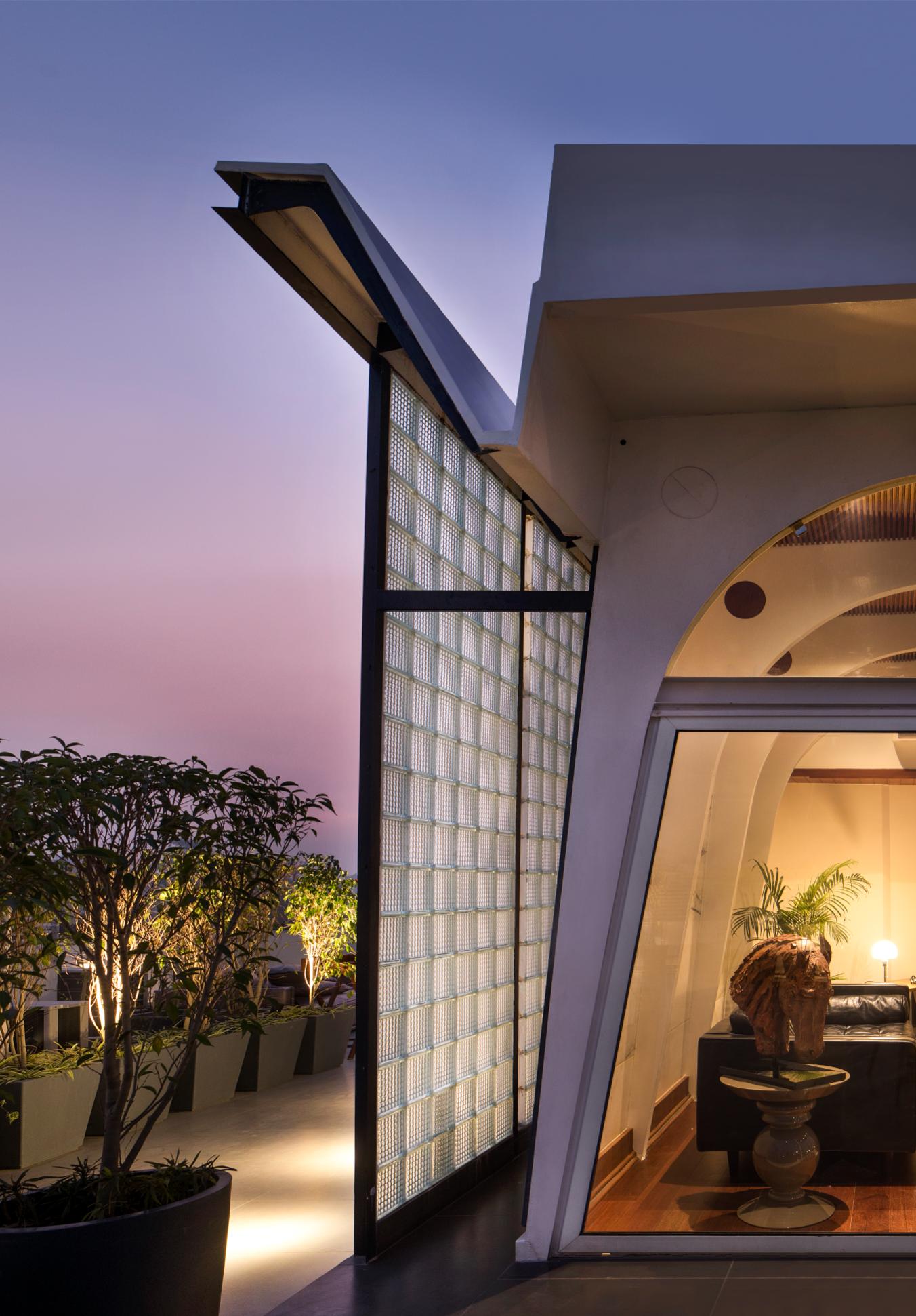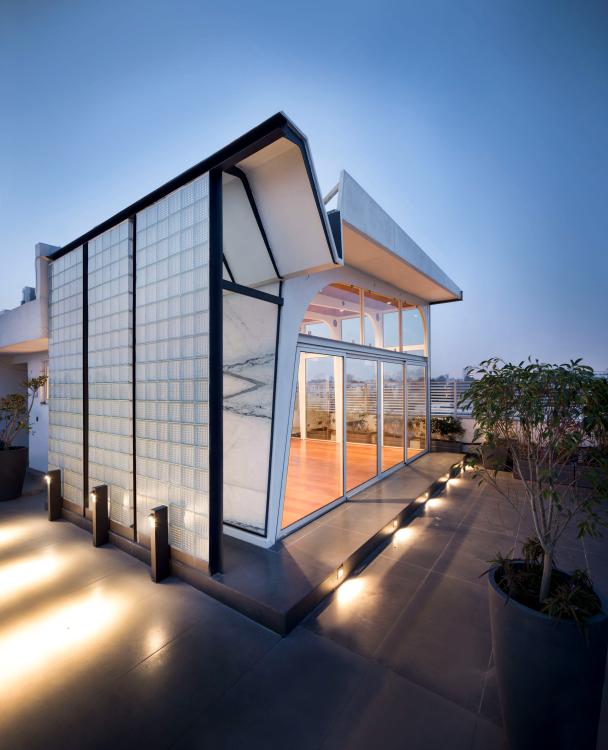 施主は、古くからデリーを拠点に活躍する実業家である。パヴィリオンは会議やゲストをもてなす社交の場として、隣接する屋上庭園と一体的に計画した。構造は、鉄骨の一連のポータルとして構想され、屋根は、ポータルの上にプリーツ状に折りたたんで張り巡らされている。北側と東側は大開口とし、南側は大理石、空気層およびガラスブロックとして熱取得に配慮した。壁のアンバジ産大理石は、厚みを調整することで障子のように半透明なスクリーンとして機能する。床と天井はチークとし、空間に温かみを与えるとともに、木目方向は屋上庭園と連続するように計画した。