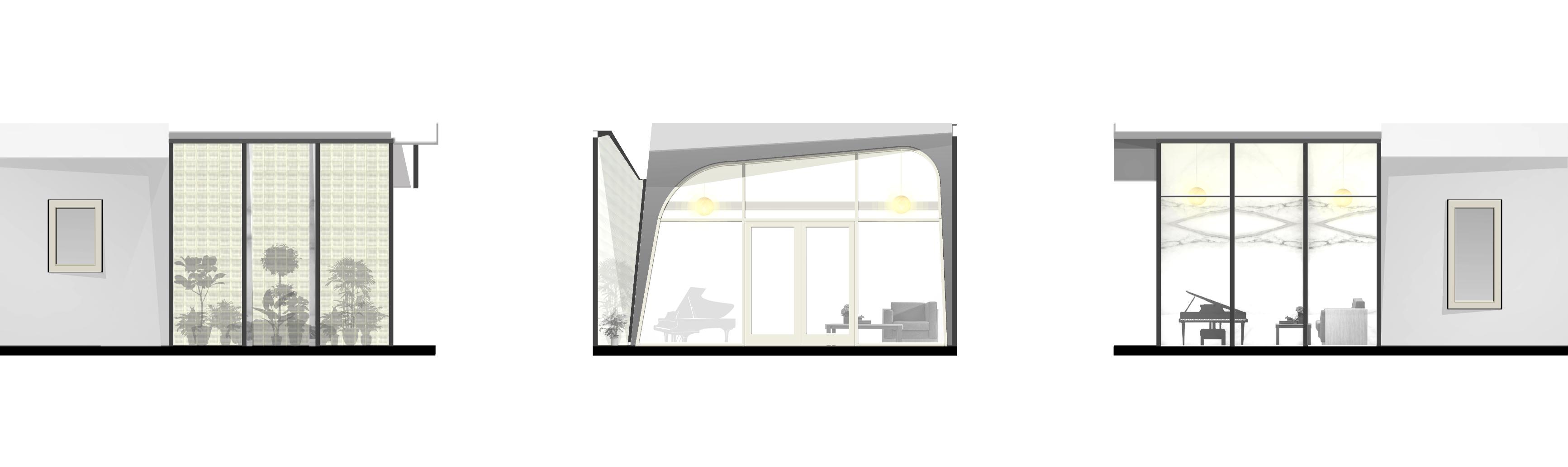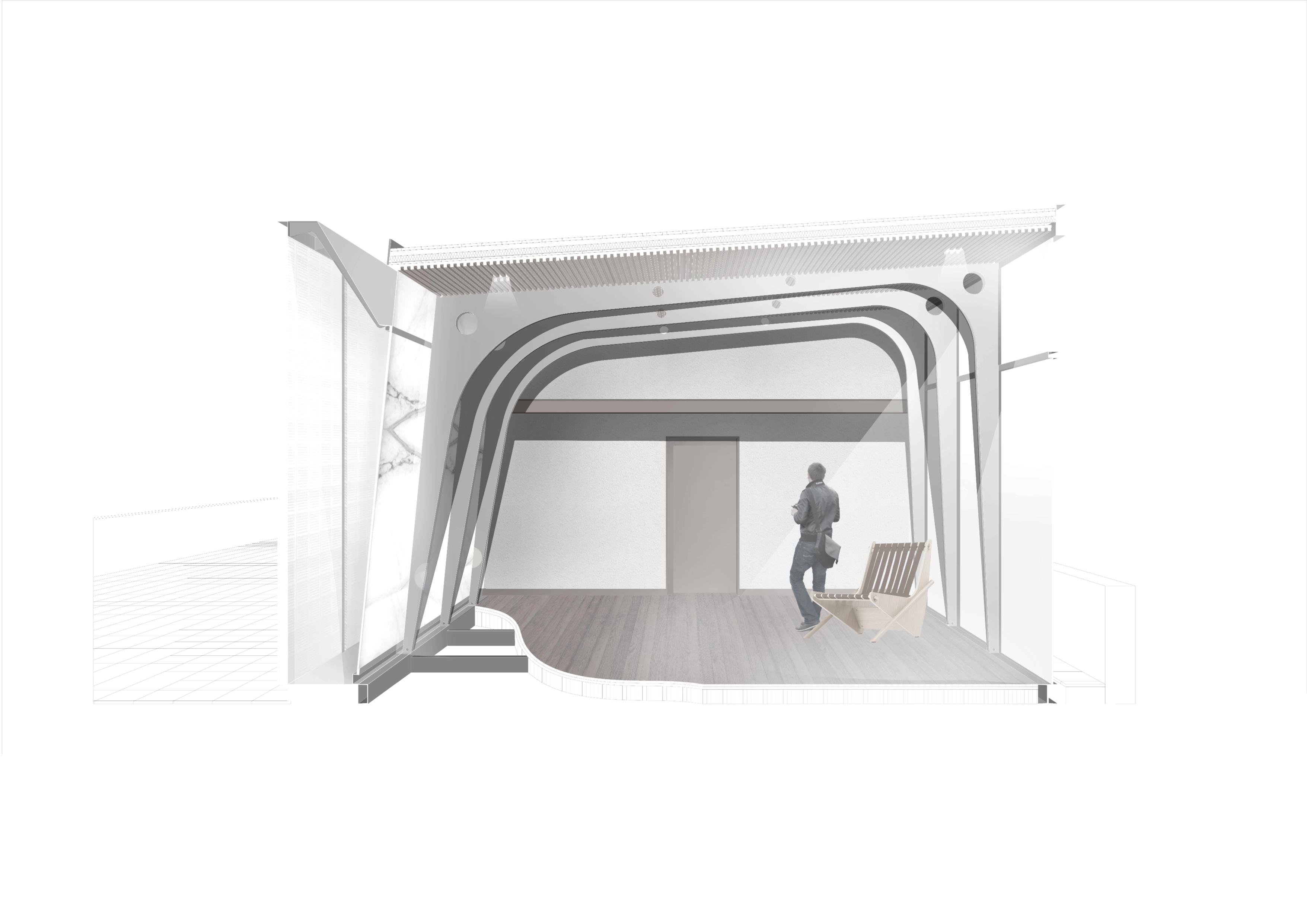 ニューデリーに計画された住宅機能拡張のためのパヴィリオン。極小敷地に対して、外部空間を積極的に取り組み浮遊感と開放感を最大化するため、1640年代と1960年代から2つの事例を参照した。1つは、ムガール時代のDiwan-i-Khasという前面広場と一体となった引張布により構成される浮遊感のある特別謁見の場である。もう一つは、コルビュジェのチャンディガールの議事堂にみられる巨大な雨樋のような屋根であり、大きな広場に向かってムガール時代のパヴィリオンのように引張材による空間拡張の役割を果たしている。