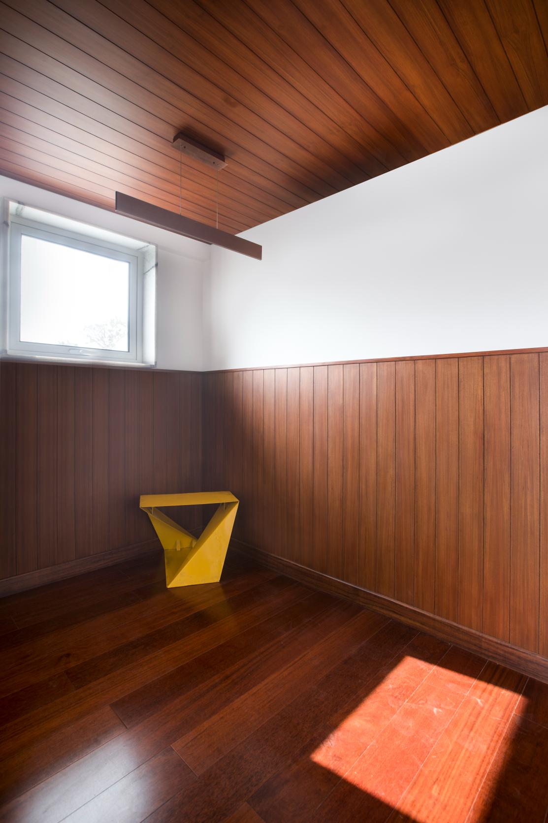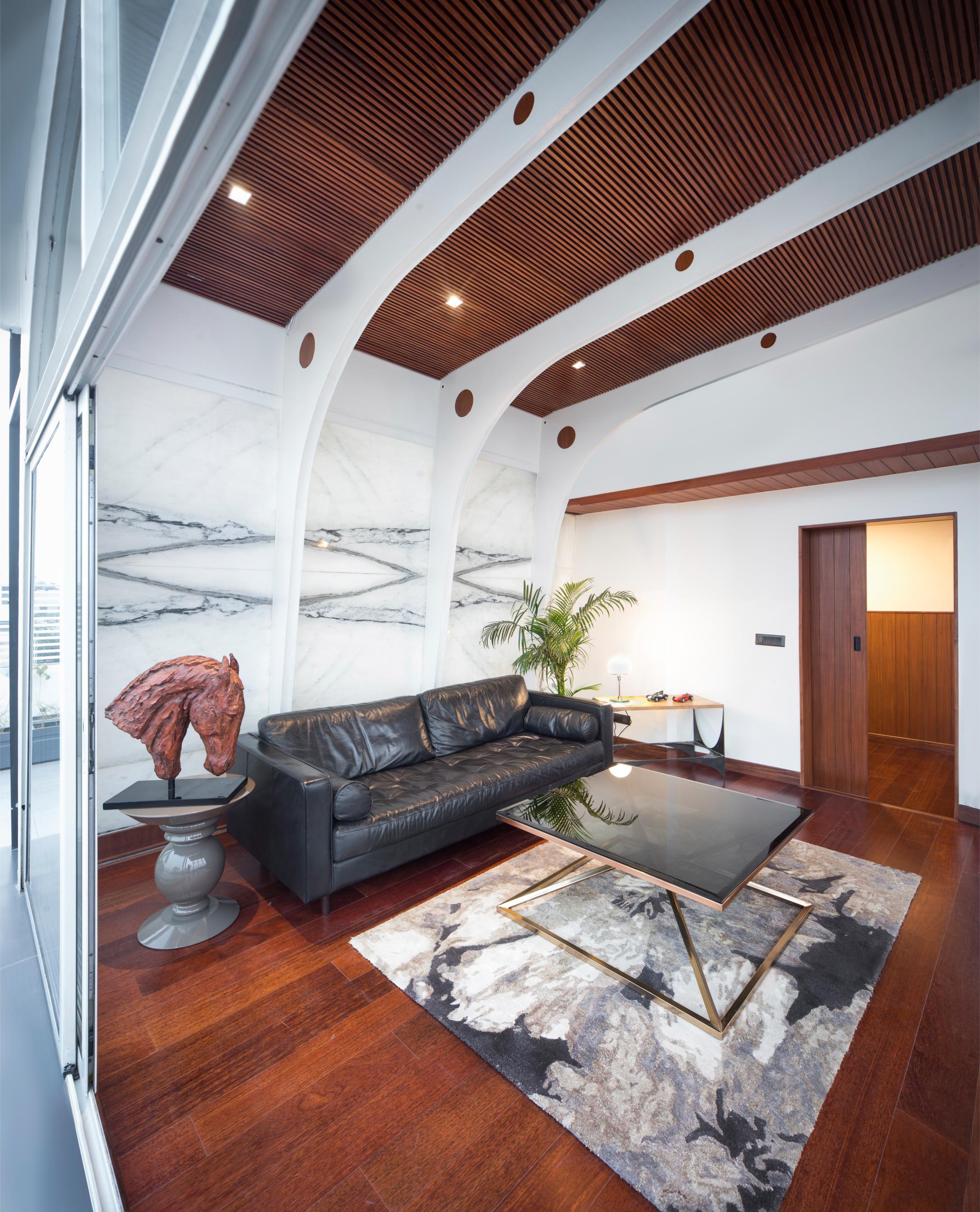 The marble for the wall is of Indian origin, found in the quarries of Ambaji. Book matched the veins of the stone panel reminds one of ‘shoji’ screens that glow due to the translucency of the marble. The wood ceiling and flooring adds warmth to the space when juxtaposed against the steel and glass. The wood paneling continues inside a small room, resembling a ship’s cabin. This space serves as the client’s private office.