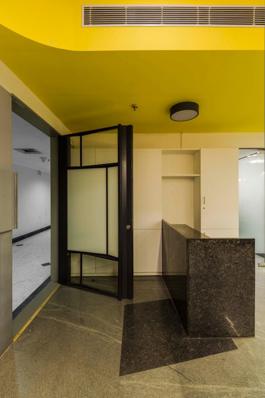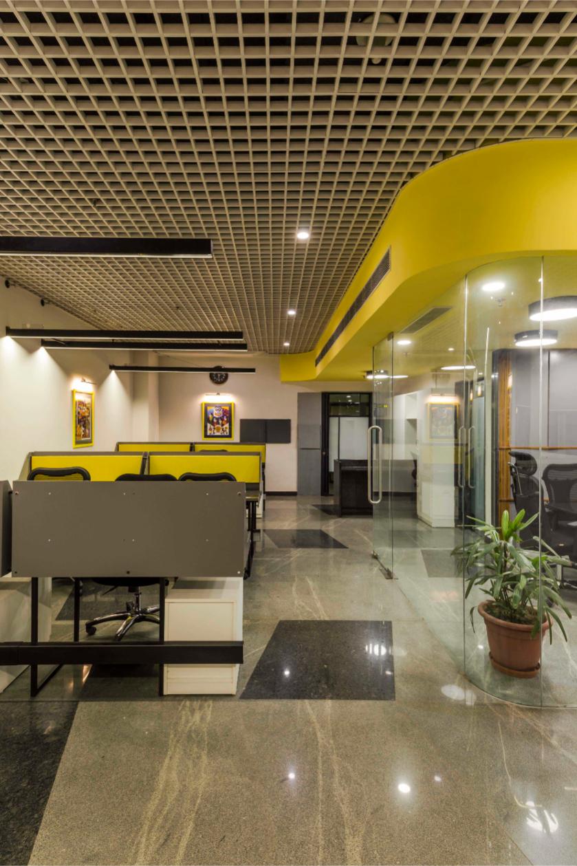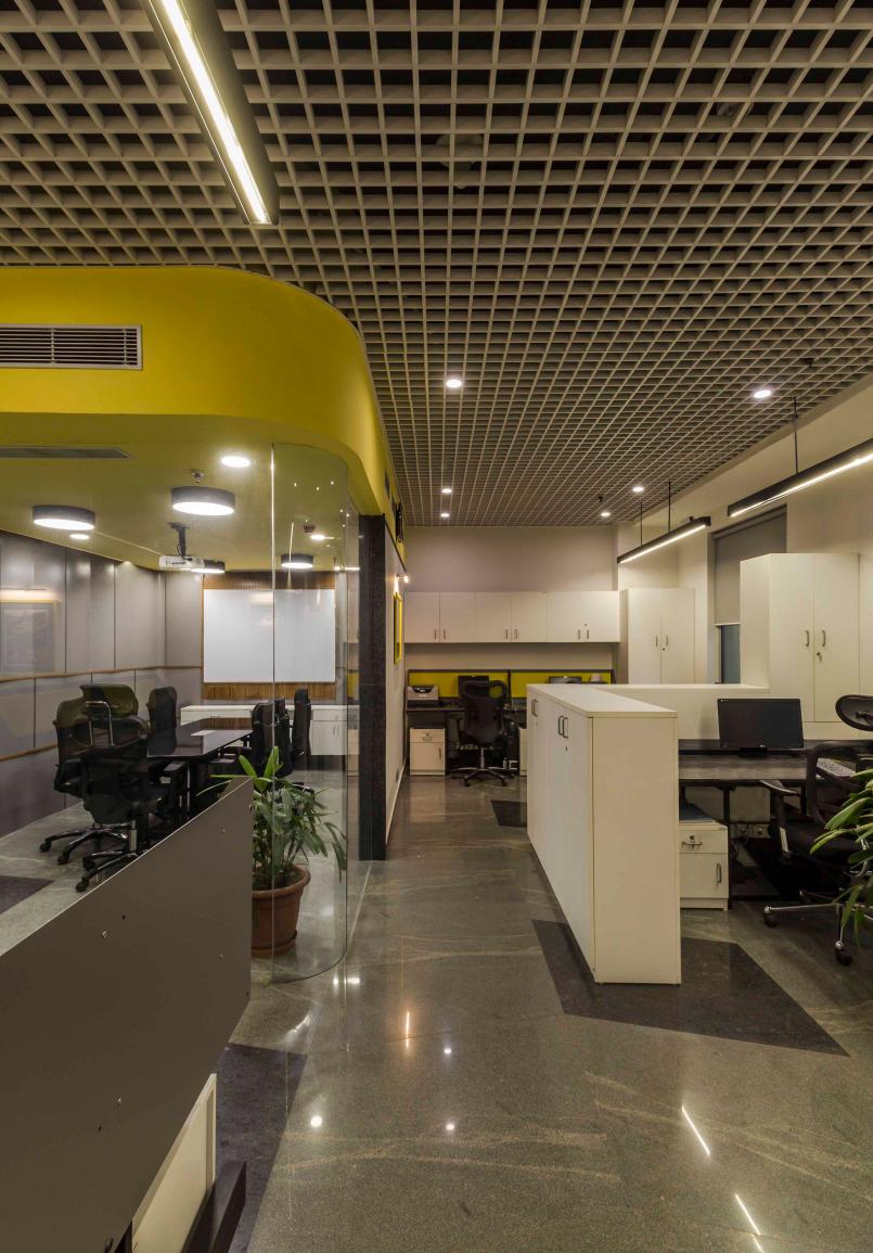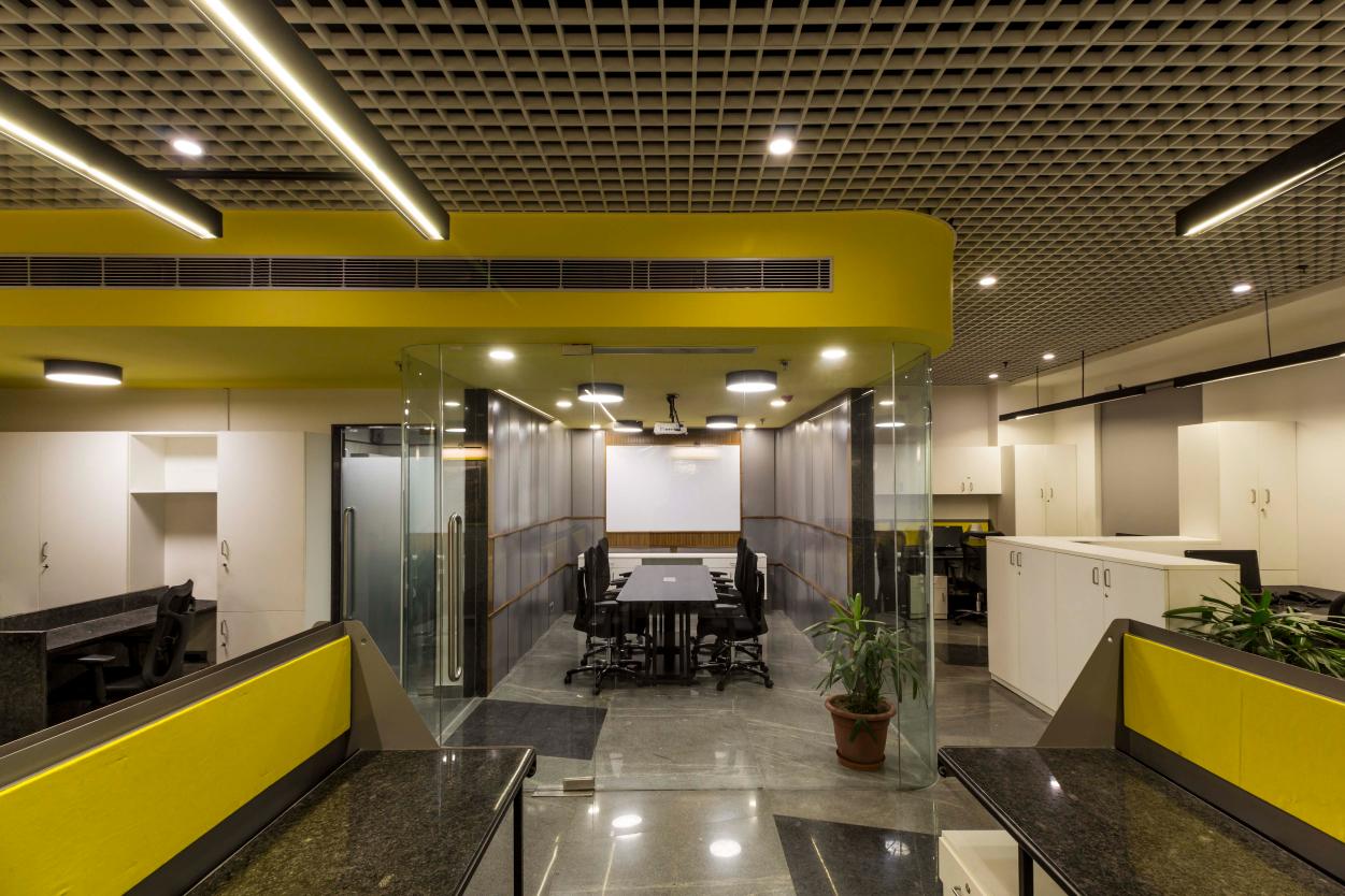 The ceiling treatment in the office is an intriguing interplay of a solid yellow hue contrasted against the checkered textured character of the open-cell false ceiling surface. Steel, glass, granite flooring & bold accents of yellow bathe the materiality of the furniture, doors & finishes in the Goodie International Office, setting an overall tone of contemporary functionality. The pieces of art were sourced personally by the Architects for the office in order to further reflect the vivaciousness & ‘pop’ vibe of the interiors.