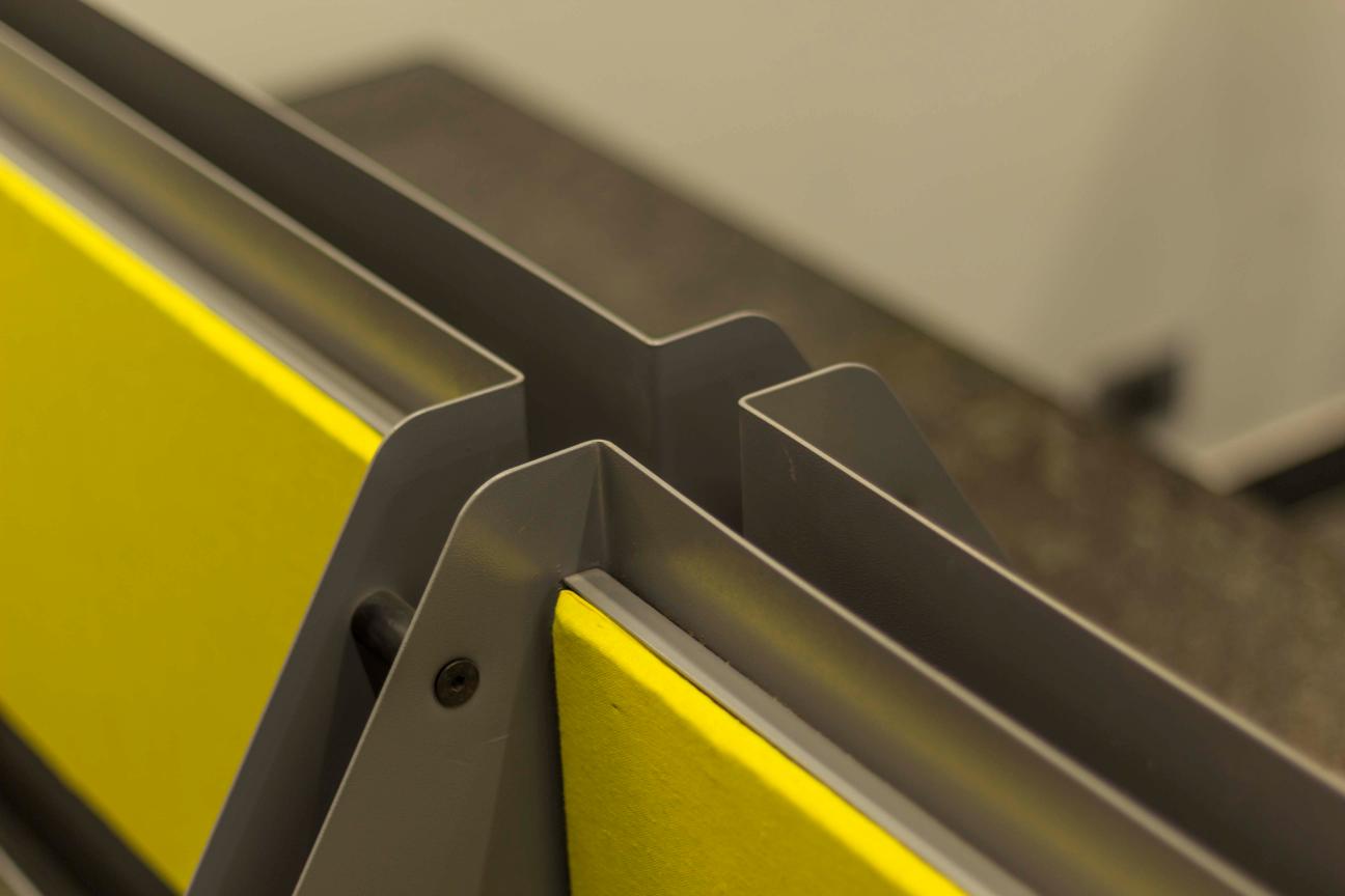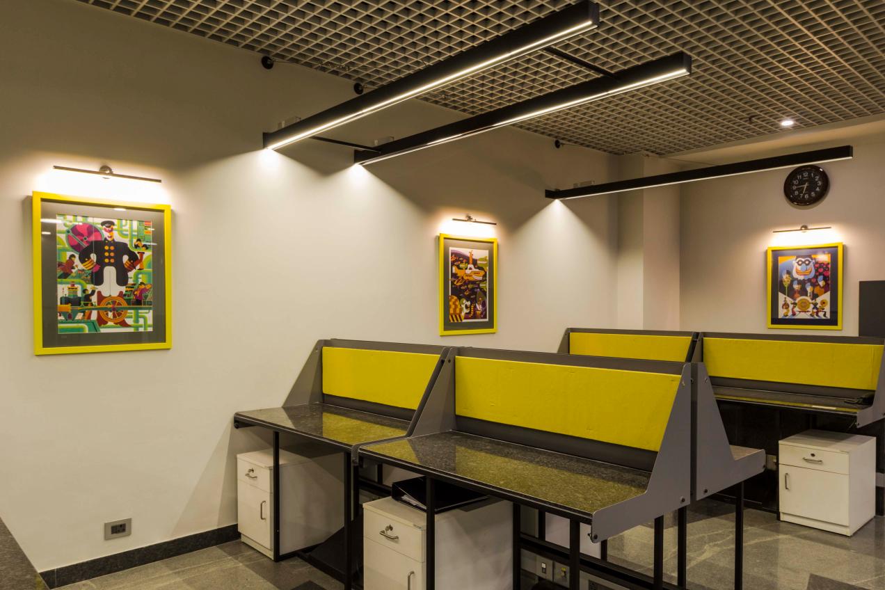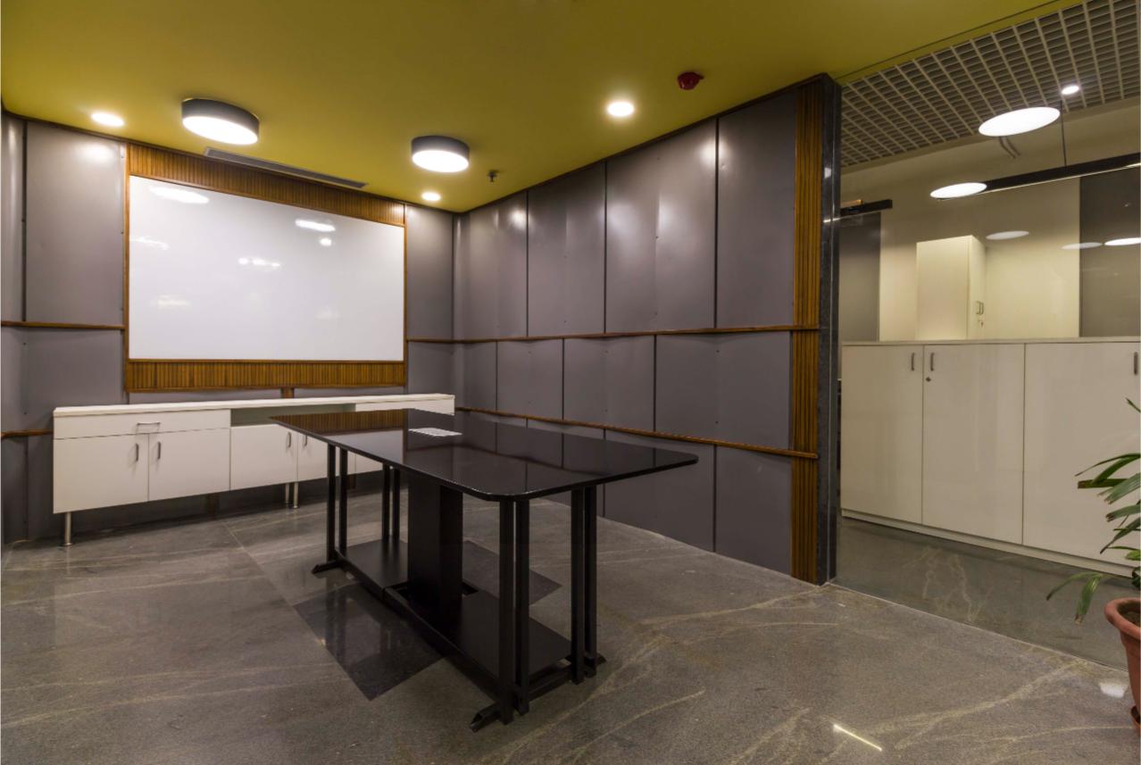The ceiling treatment in the office is an intriguing interplay of a solid yellow hue contrasted against the checkered textured character of the open-cell false ceiling surface. Steel, glass, granite flooring & bold accents of yellow bathe the materiality of the furniture, doors & finishes in the Goodie International Office, setting an overall tone of contemporary functionality. The pieces of art were sourced personally by the Architects for the office in order to further reflect the vivaciousness & ‘pop’ vibe of the interiors.