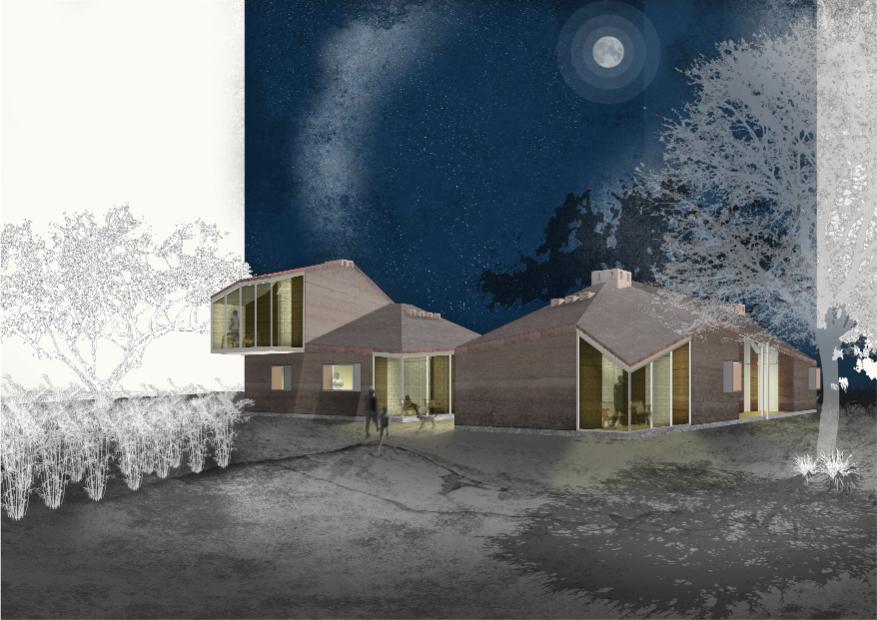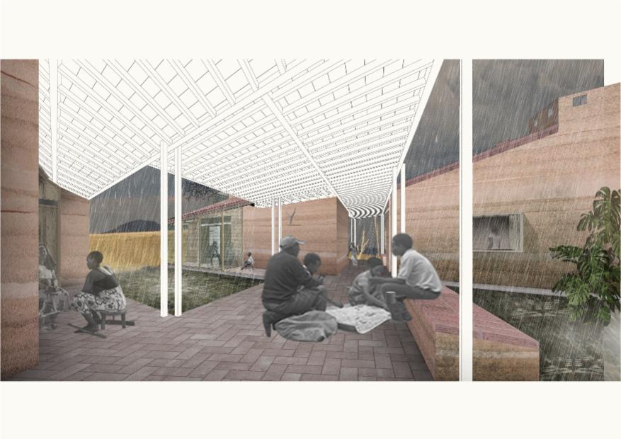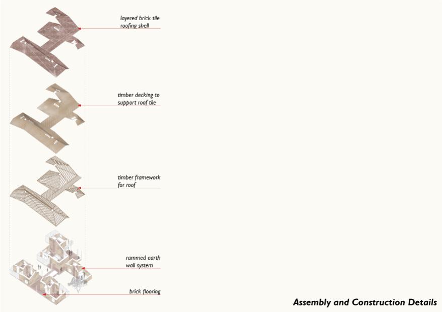 Building upon traditional forms and materials. The proposed house represents a considered translation of the Jorejick’s existing traditional hut into novel, yet locally sourced, materials. Instead of a thatched roof, we propose a more permanent alternative in the form of a layered brick tile roof laid over a timber frame. This faceted sloping roof provides improved heat and sound insulation while also allowing for rainwater collection. Load-bearing rammed earth walls replace adobe, providing excellent thermal performance.