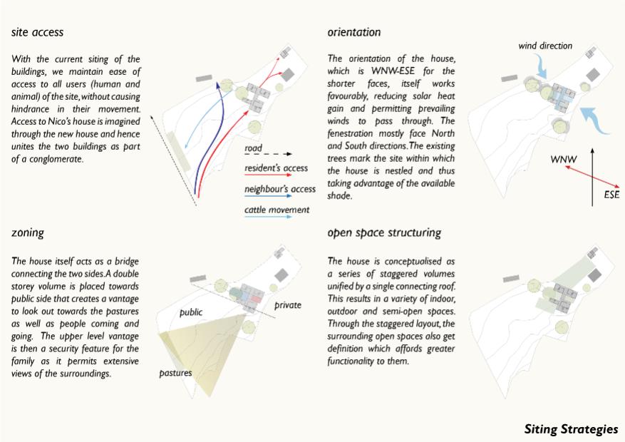 Sensitive situating. Our approach to siting the Jorejick house is to work with existing site conditions and boundaries, which include trees, the cattle pen, and Nico’s house. The house’s connected spaces are advantageously nestled amongst existing trees in order to avail of their shade. The house is also oriented along WNW-ESE axis so as to reduce solar heat gain and permit the passing through of prevailing winds. Additionally, the fenestration mostly faces North and South.