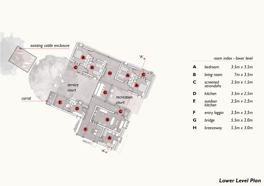 We envision the Jorejick family home as an interconnected series of spaces designed to align with the lives of its many members and its particular cultural-geographic context. The aim is to create a sense of positive “dwelling” (to draw upon Heidegger) by playing close attention to the relationship between the property’s inhabitants (human and animal) and spaces defined by boundaries (built and natural).