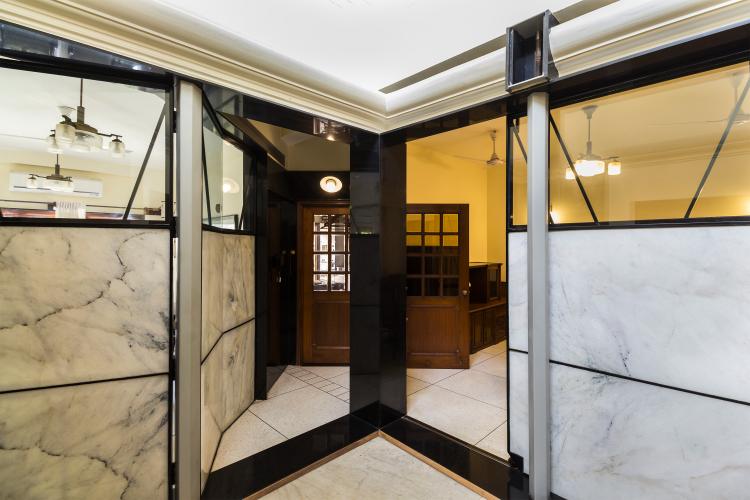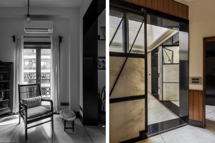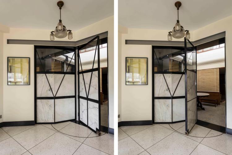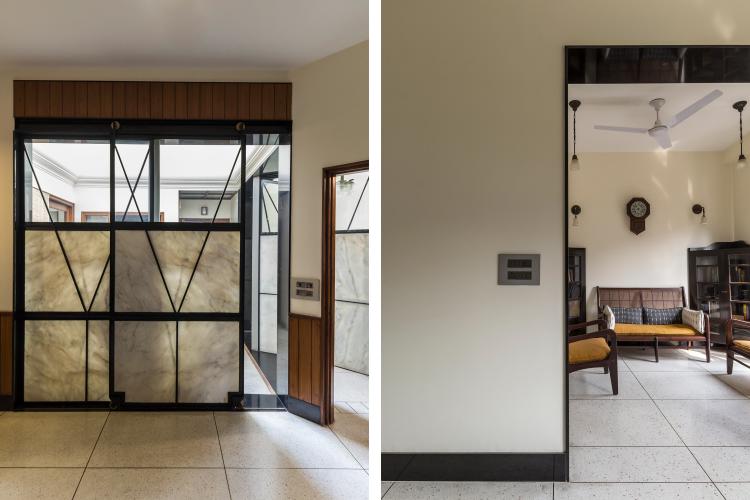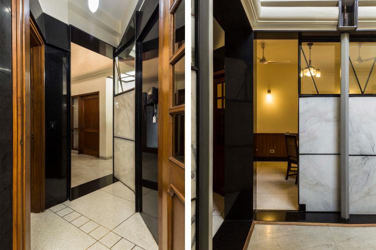The renovation called for removal of walls and an insertion of a lighter partitioning system that could modulate the light entering the rooms. Custom designed and fabricated partitions with polished translucent Indian white marble inserts were installed. The marble glows when backlit with daylight or incandescent bulbs on either side of the screen. These screens are reminiscent of the Japanese ‘shoji’. Two types of doors were designed with custom brass hardware, one swing and the other sliding.