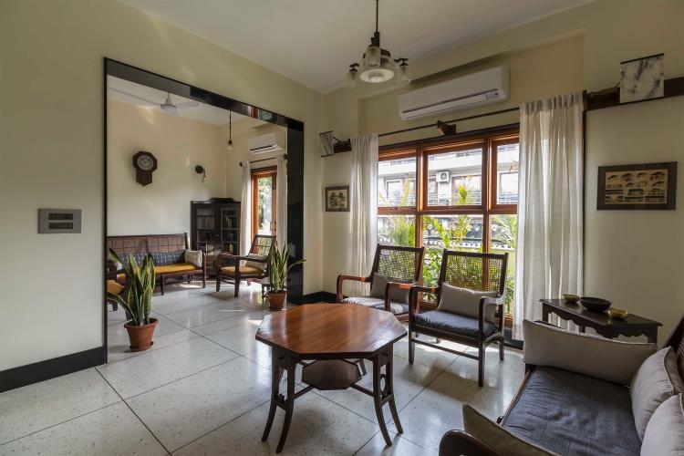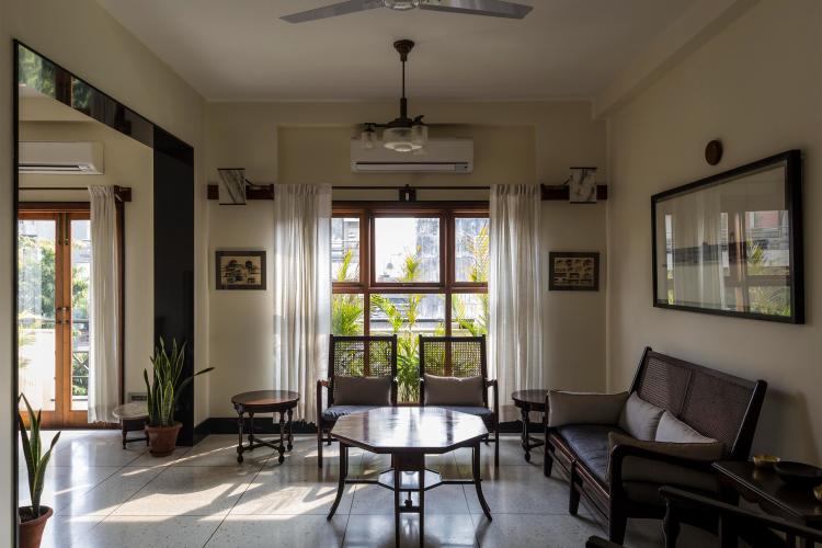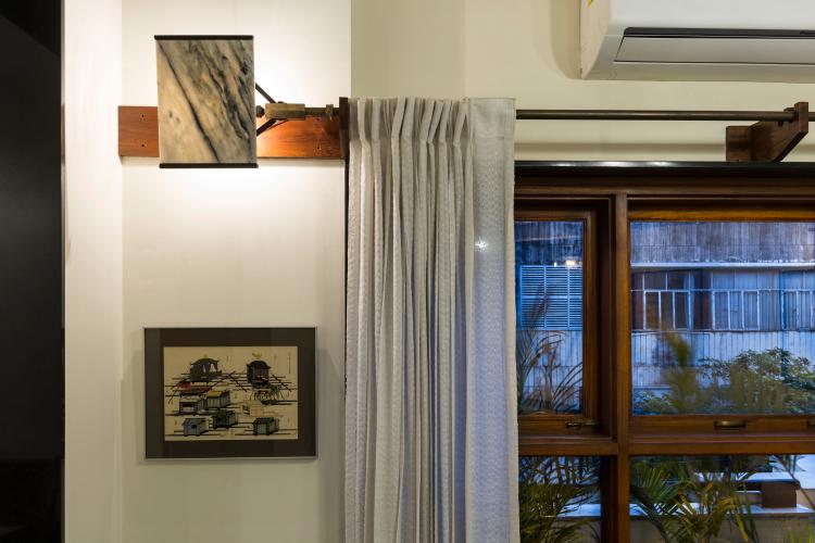 The renovation of this 25-year-old apartment entailed the re-arrangement of spaces, which includes a living room, a dining room, a kitchen accessed through a central atrium. The gradient of light that enters through the fenestrations on the eastern façade is punctuated by the rectangular atrium around which all the spaces are arranged. In a clockwise manner, one enters from the north; towards the east is the living room, dining room on the south and the remainder of the dwelling in the west. The kitchen being in the south-east corner, a diagonal was cut to access the same. The atrium is the point of arrival, which is mostly illuminated from the top light as an additional source of daylight.