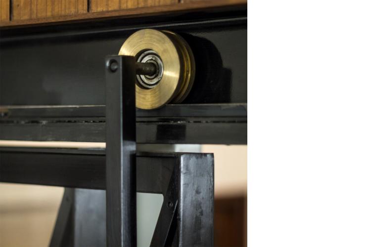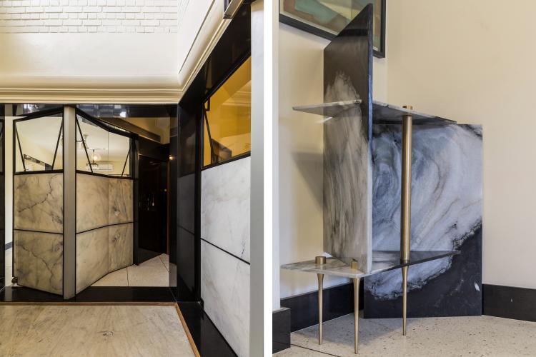 The steel framed marble screens take support from the central steel columns that in turn support the R.C.C. beams above. These oddly shaped steel supports were added after the original masonry walls were removed. The odd shapes of the columns give directionality to the screens. The ‘screw-bolt’ used to support the beam is expressed as a totem and a reminder of the structural systems at play, constantly engaging gravity.