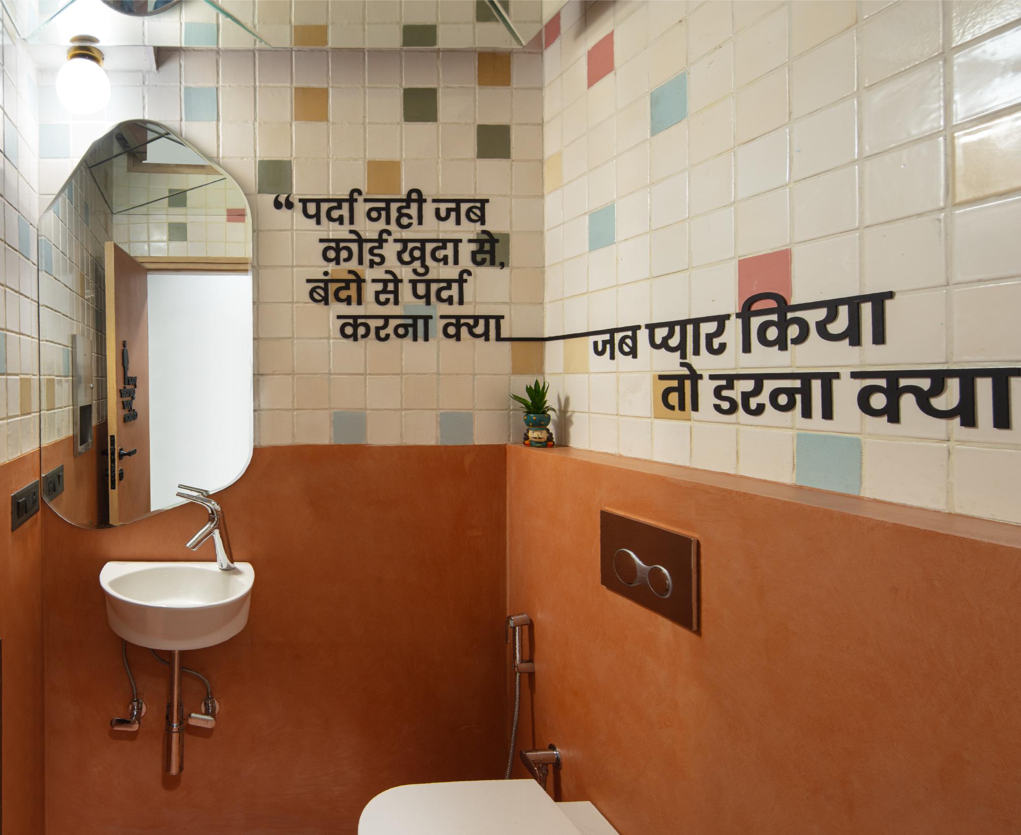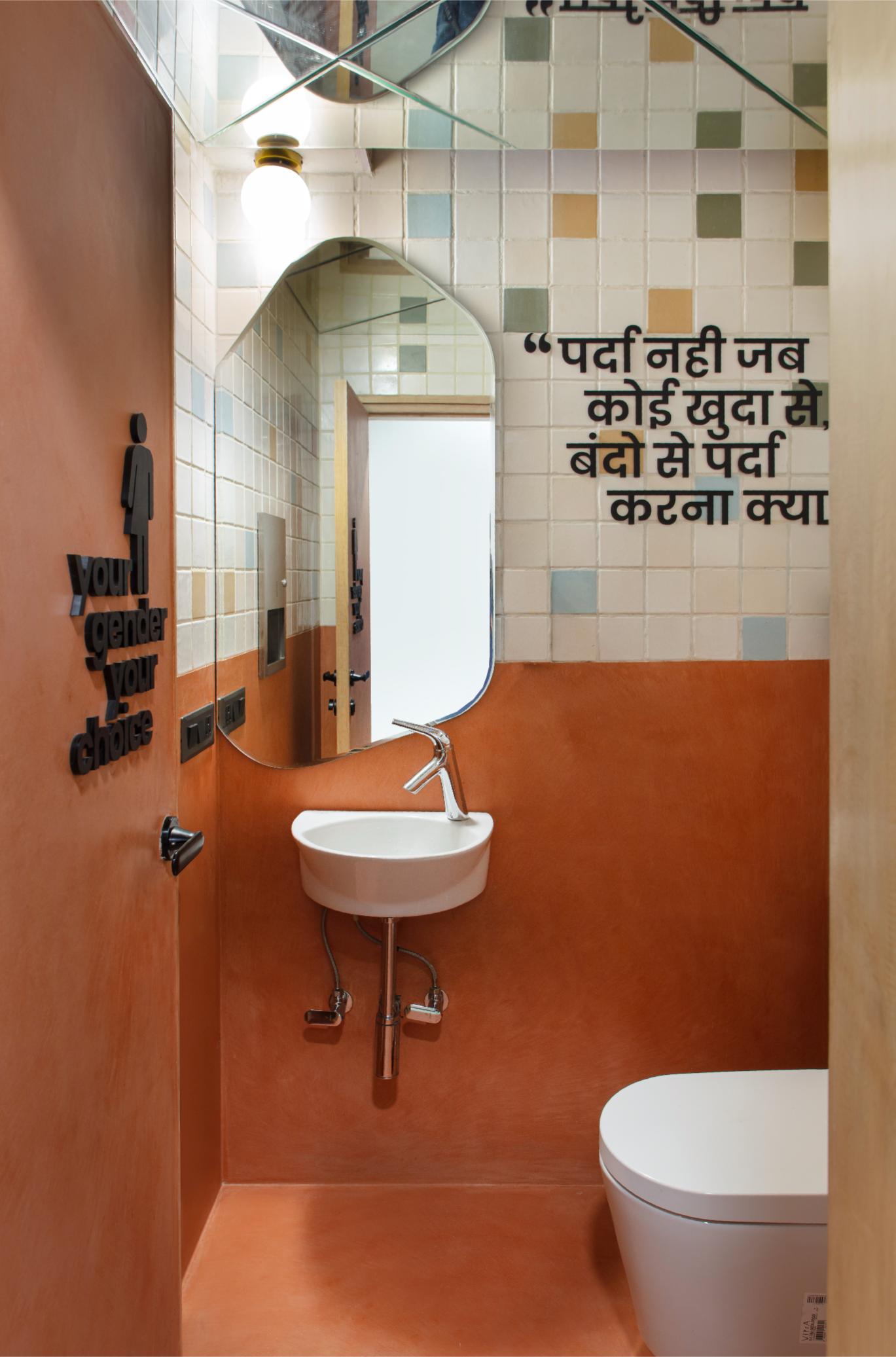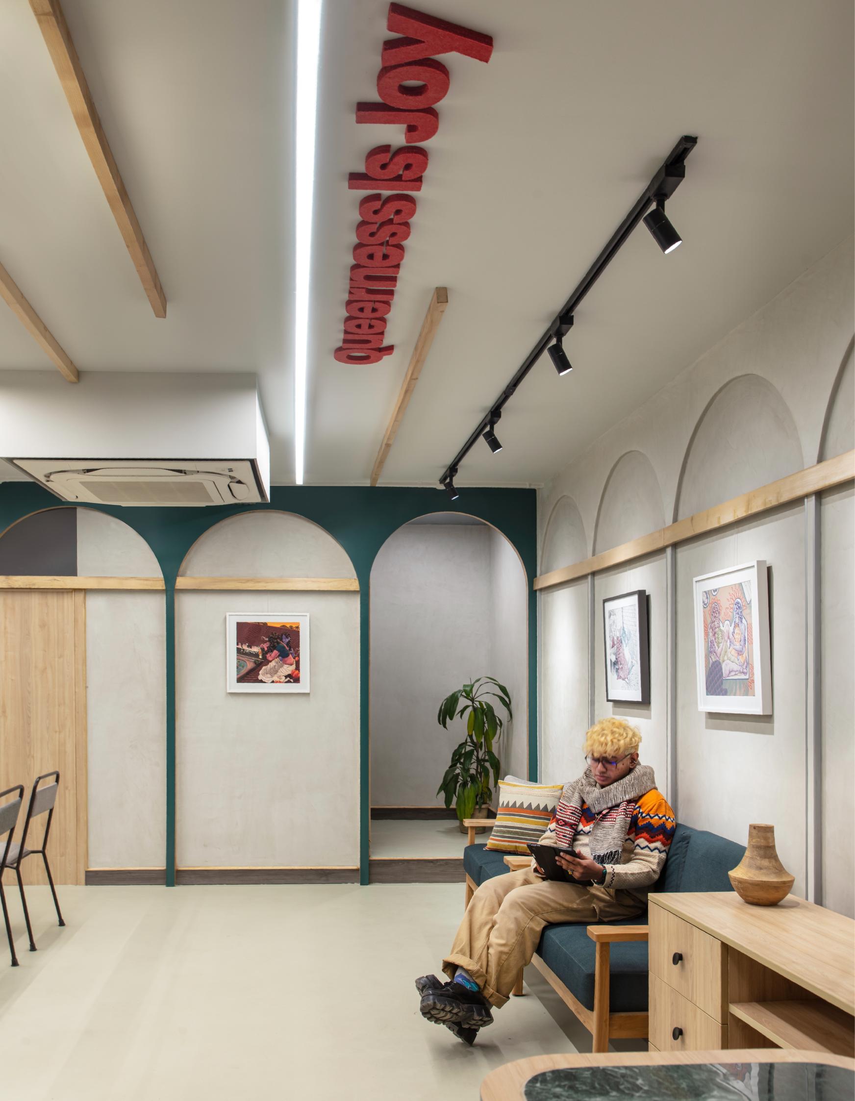 The main hall itself is versatile, with adaptable furniture that facilitates various arrangements for events such as book launches, group discussions, film screenings, performances, and more. Iconic phrases from queer history are placed on the ceiling – as a constant reminder of the ideas that have guided the queer rights movement across the world. A small reading nook, in the form of a free standing bookcase and high tables, acts as a repository of books on queer literature and history that provide easy access to anyone who is interested in delving into those aspects of the queer movement.