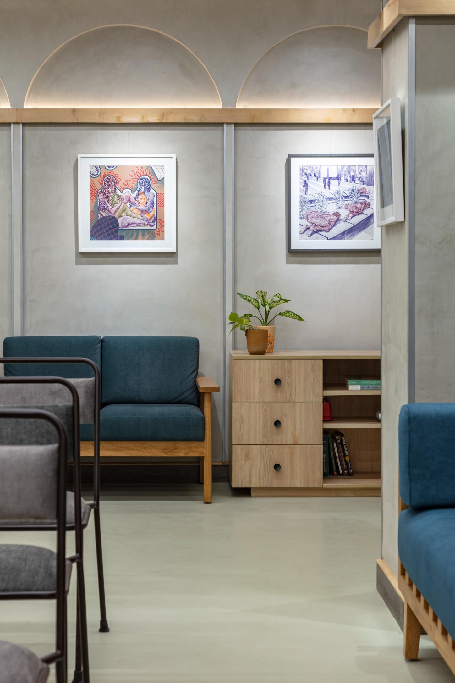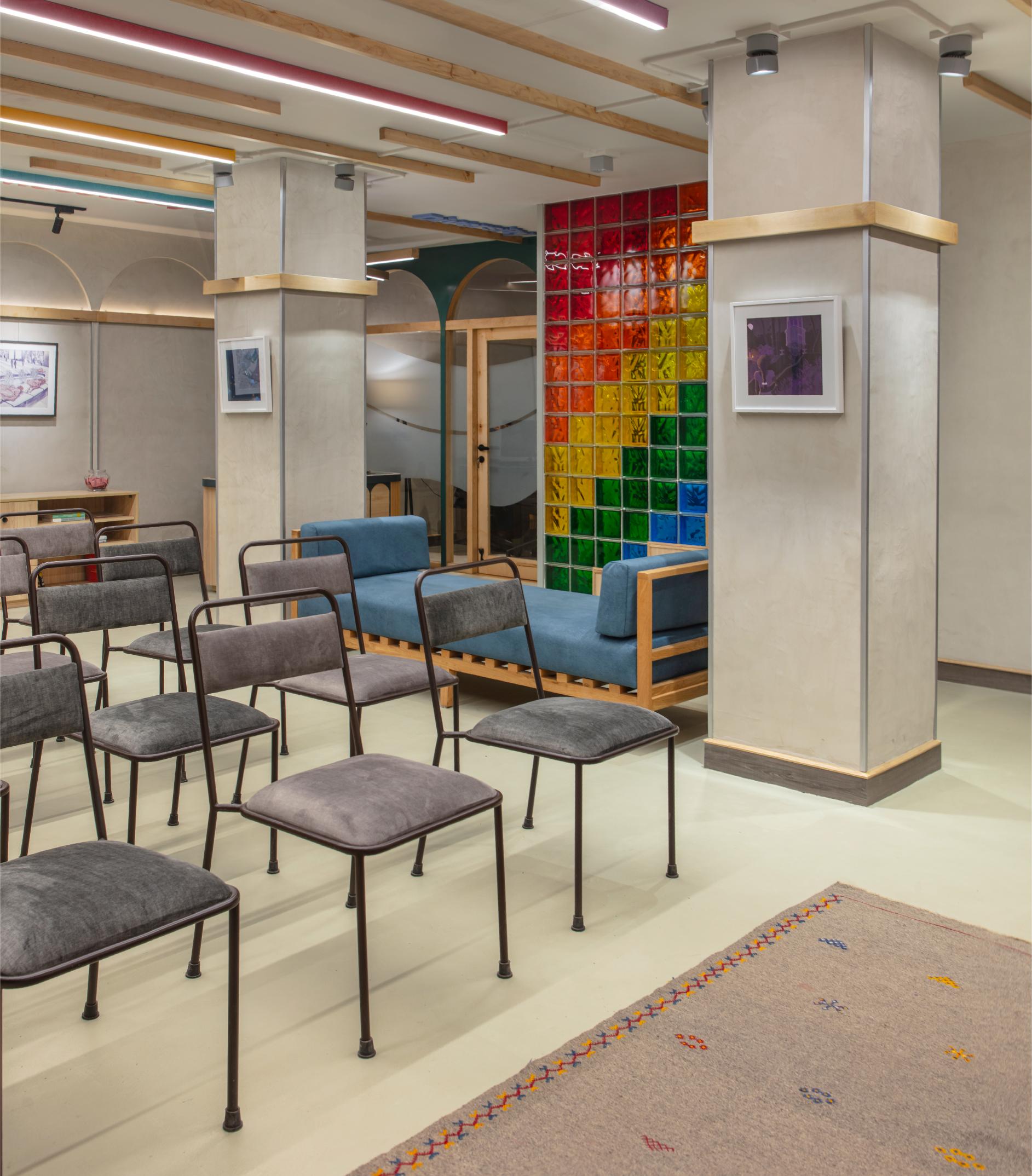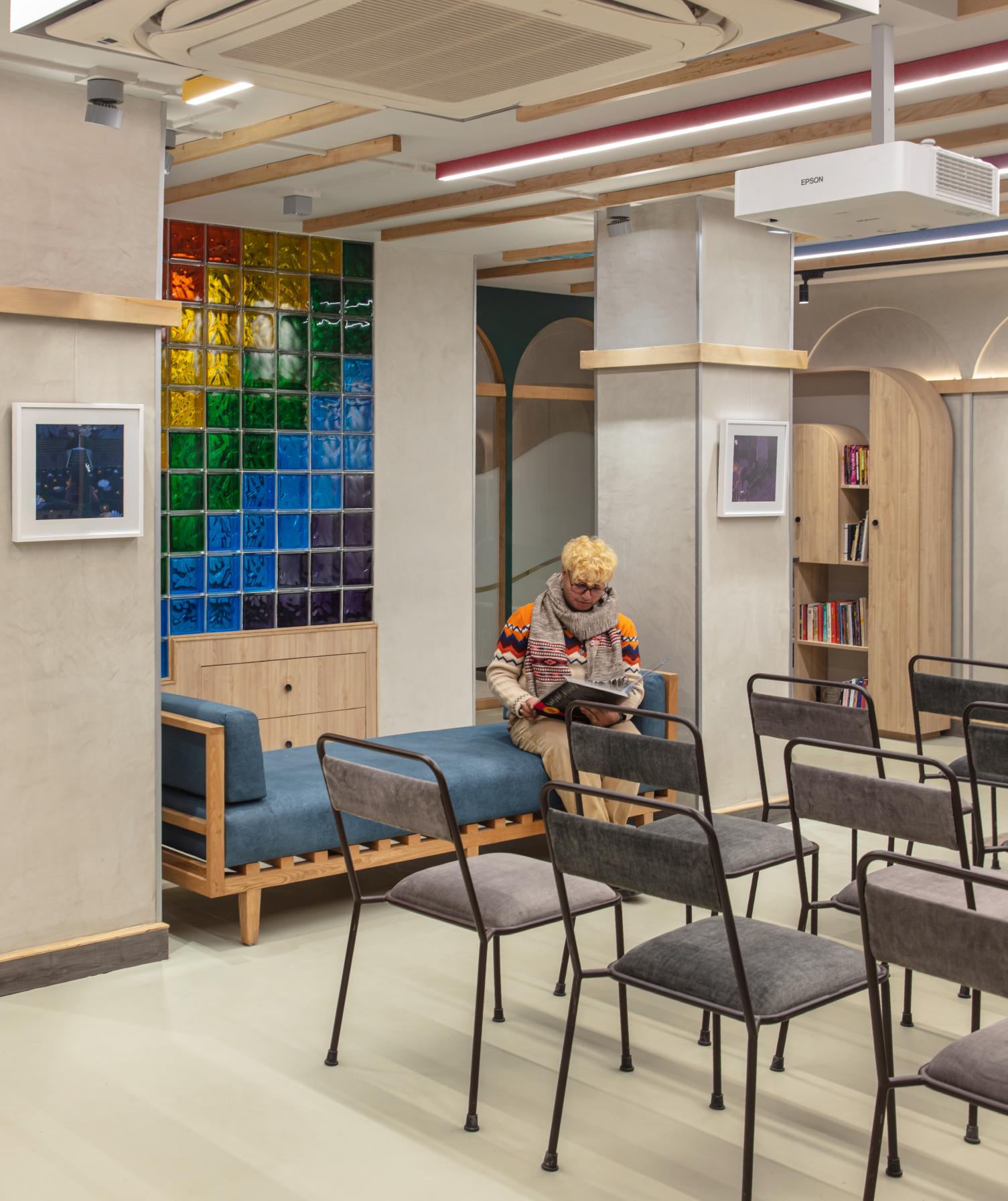 The facility is managed by a director with a scheduled calendar of events, it welcomes the entire community and boasts multifunctionality. Keeping in mind the versatility and adaptability that was necessary for the centre to operate to its full potential, a carefully curated material palette was paired with intentionally chosen design elements that together set the stage for unfolding of the exciting events and activities planned for this one-of-a-kind community institution. The space features a soft grey neutral palette, allowing diverse art forms to shine – the centre was intended to be used as art gallery, displaying works by queer artistes that are meant to be rotated periodically. The walls are finished in durable lime plaster, while the floor boasts a resilient industrial grade flooring material. Light-toned timber furniture and ceiling slats lend the space an international yet rooted feel.