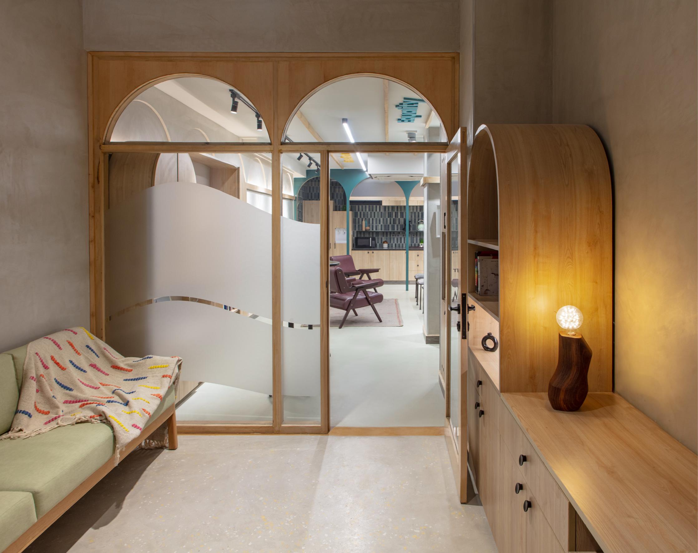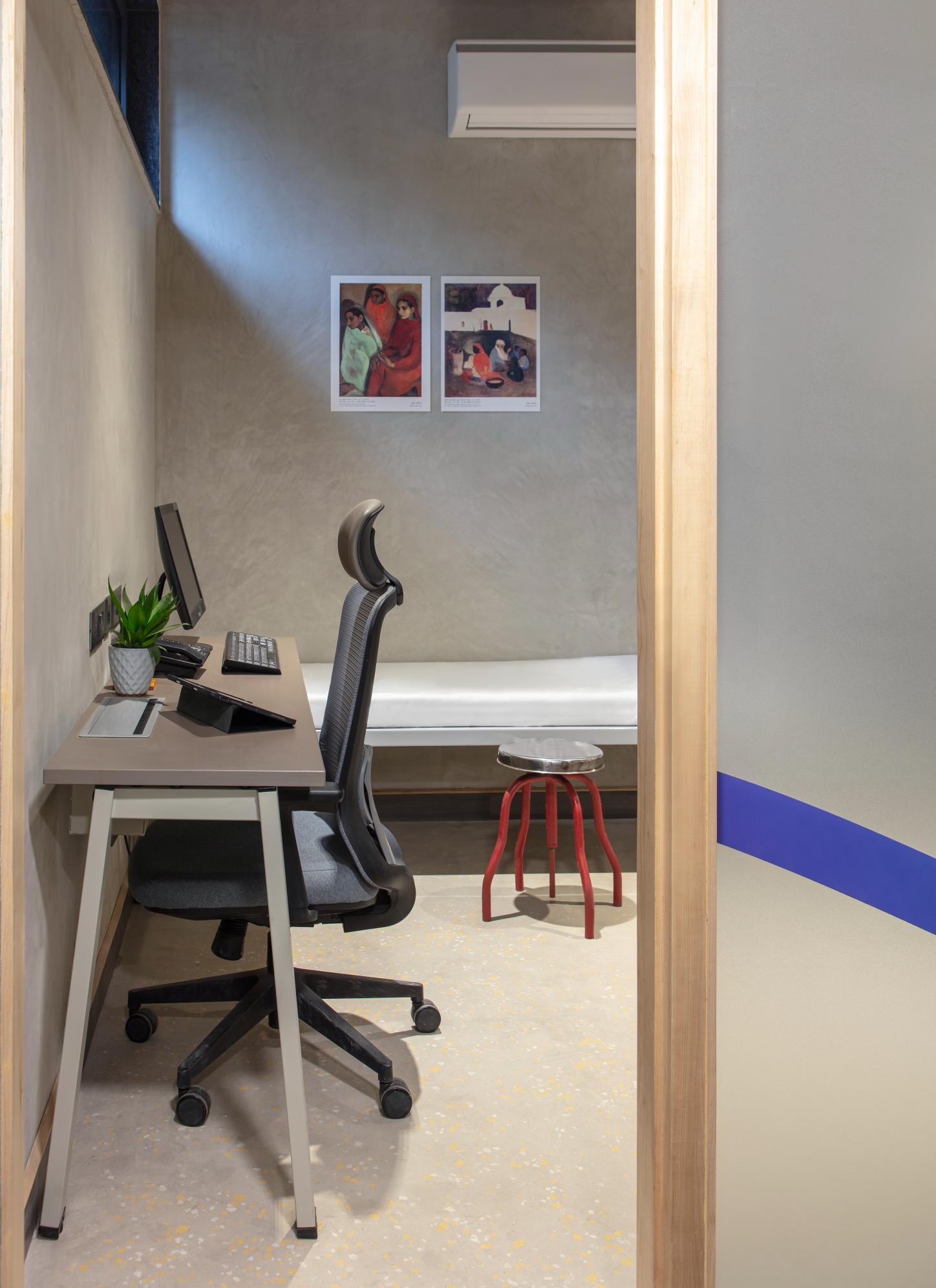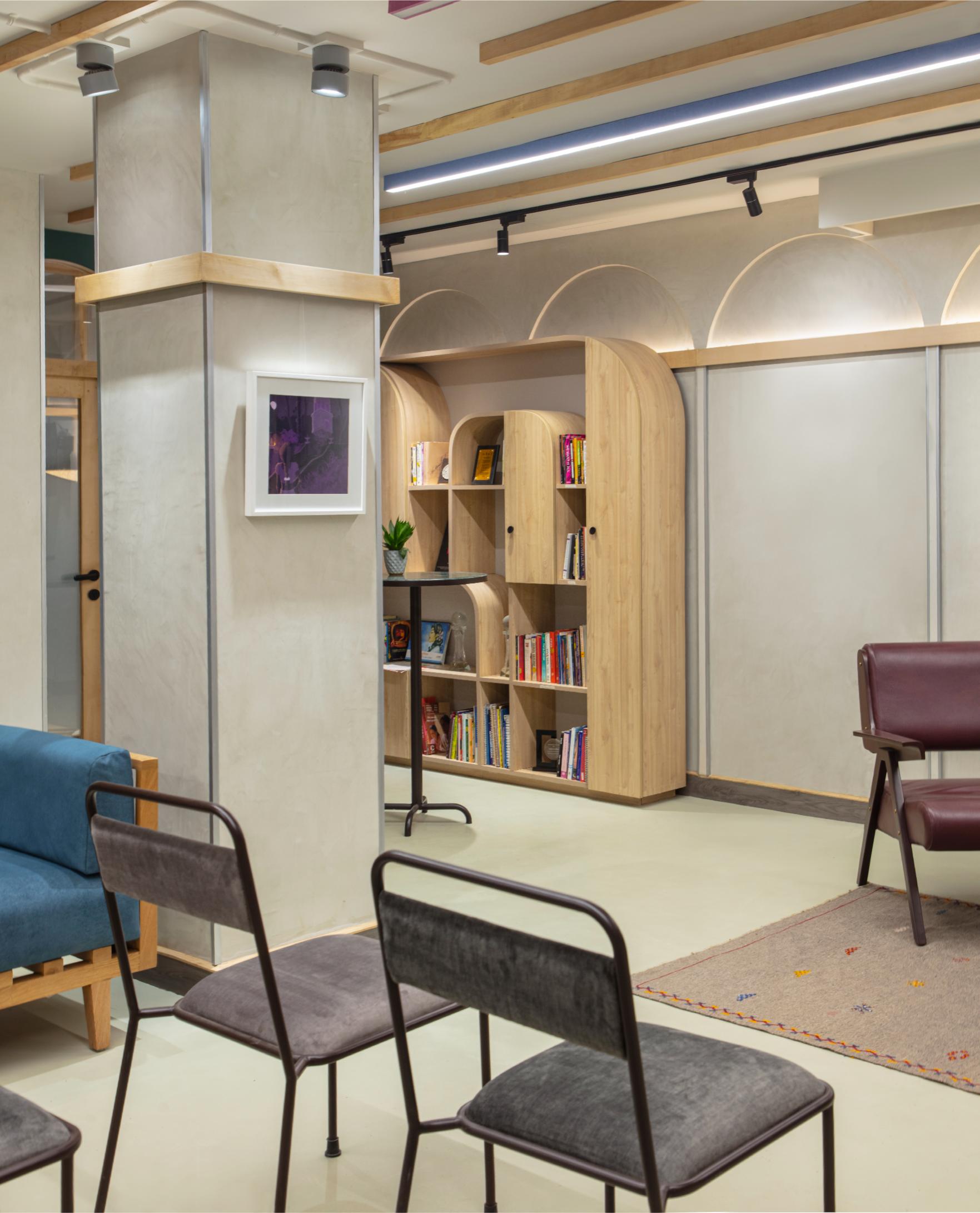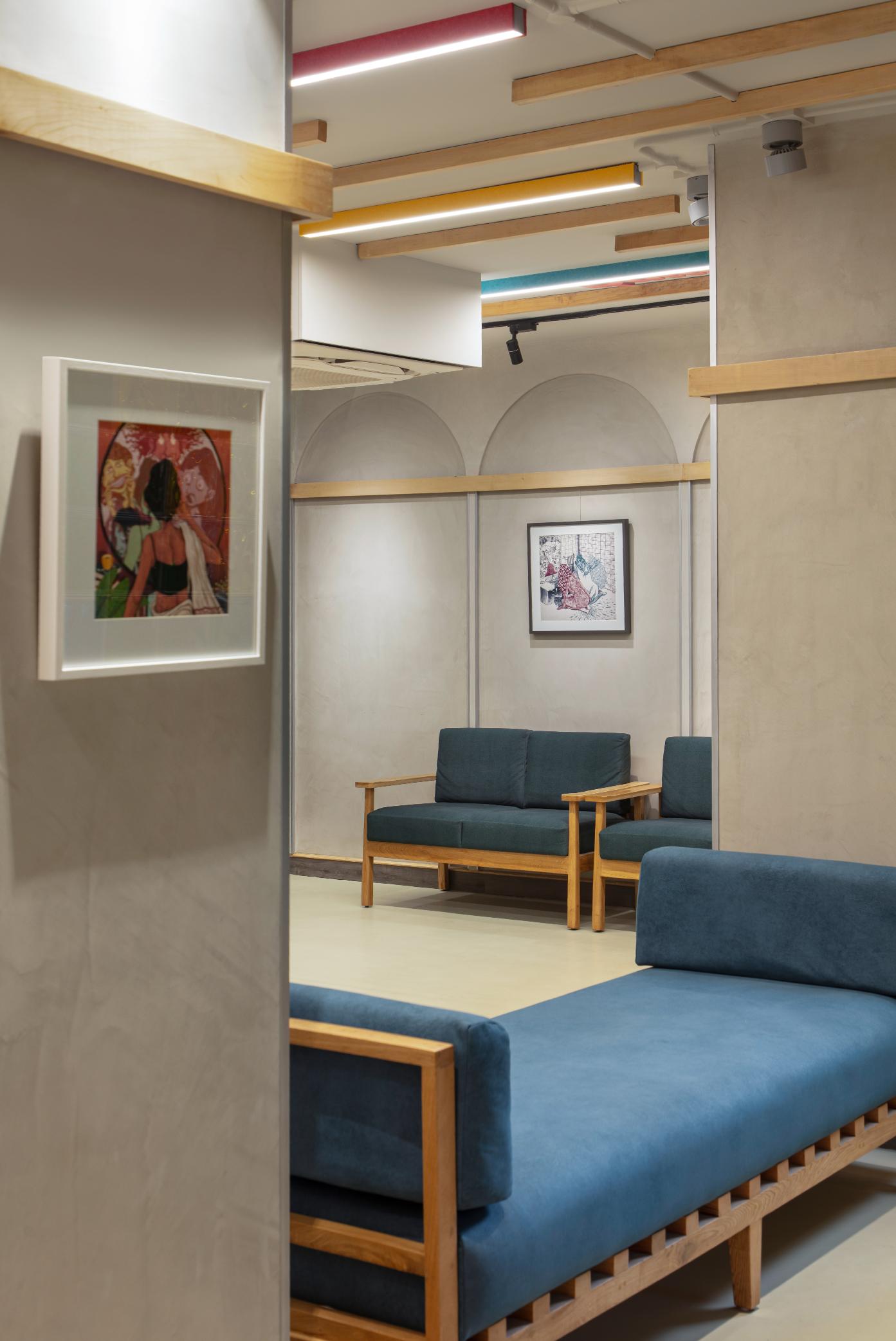 The facility is managed by a director with a scheduled calendar of events, it welcomes the entire community and boasts multifunctionality. Keeping in mind the versatility and adaptability that was necessary for the centre to operate to its full potential, a carefully curated material palette was paired with intentionally chosen design elements that together set the stage for unfolding of the exciting events and activities planned for this one-of-a-kind community institution. The space features a soft grey neutral palette, allowing diverse art forms to shine – the centre was intended to be used as art gallery, displaying works by queer artistes that are meant to be rotated periodically. The walls are finished in durable lime plaster, while the floor boasts a resilient industrial grade flooring material. Light-toned timber furniture and ceiling slats lend the space an international yet rooted feel.