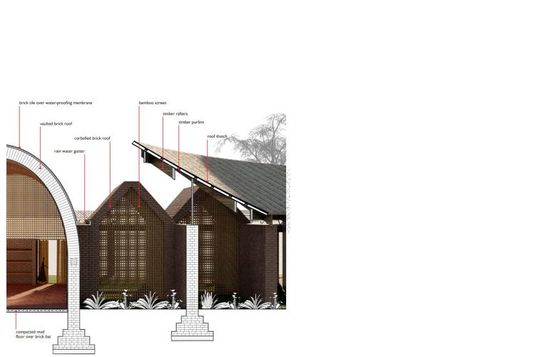 We referred diagrams drawn by Aldo Van Eyck to structure the various spaces. Trees act as anchors around which we are creating circular courtyards. A series of parallel walls then contain the required functions. We are considering locally produced bricks as the construction material for walls and roofs which may be vaulted or corbelled. We believe we can employ basic local skill to construct these structures. The circular courtyard enclosures have thatched roofs over timber frames that slope down towards the courtyard. The rainwater run-off can then be collected in underground cisterns within the courtyard. Furthermore, a light timber frame spans over the interstitial spaces that carry solar collectors that can generate power for the school and to some extent for the larger community. Such installations may also be eligible for international aid that may help with the construction of the center.