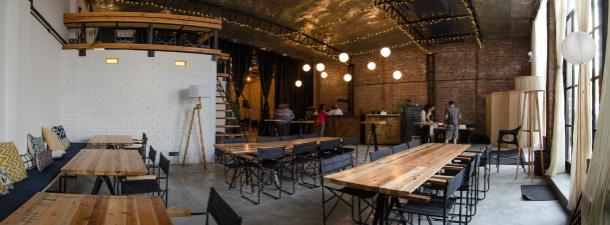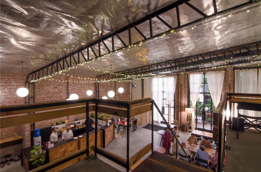 A raw concrete floor, unfinished brick masonry walls & exposed air conditioning ducts set the stage for the unravelling of the fuss-free interior scheme. Low cost & sustainable reclaimed wooden furniture punctuated with eclectic upholstery, whimsical elements of suspended fairy lights & custom floor lamps weaved the quaint narration of the designed space. Tall floor to ceiling industrial-style glass doors & windows grace the elevation of the building in synchrony with light ivory drapes, that add an element of visual interest & lowkey privacy to the space. With its warm & new age milieu, the Oddbird Theatre is a microcosm of a performance venue that unshackles itself from the stereotypical template of cultural locations. The project has been able to cultivate a renewed ‘habit’ of sorts for the audiences to devour their creatively stimulating environment and has made performing arts a more tangible experience.