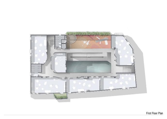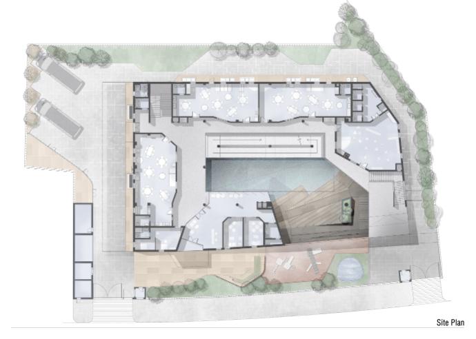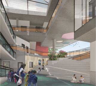 建物中央部にスロープとヴォイドをもつ中庭型の構成とし、各階が分断されることなく緩やかにつながり、フレキシビリティの高い様々なアクティビティが交錯するオープンスペースを目指した。また、1階から地下に向かう大階段は学外活動にも利用できる社会的舞台として、教室エリアと視覚的に連続した空間として計画した。