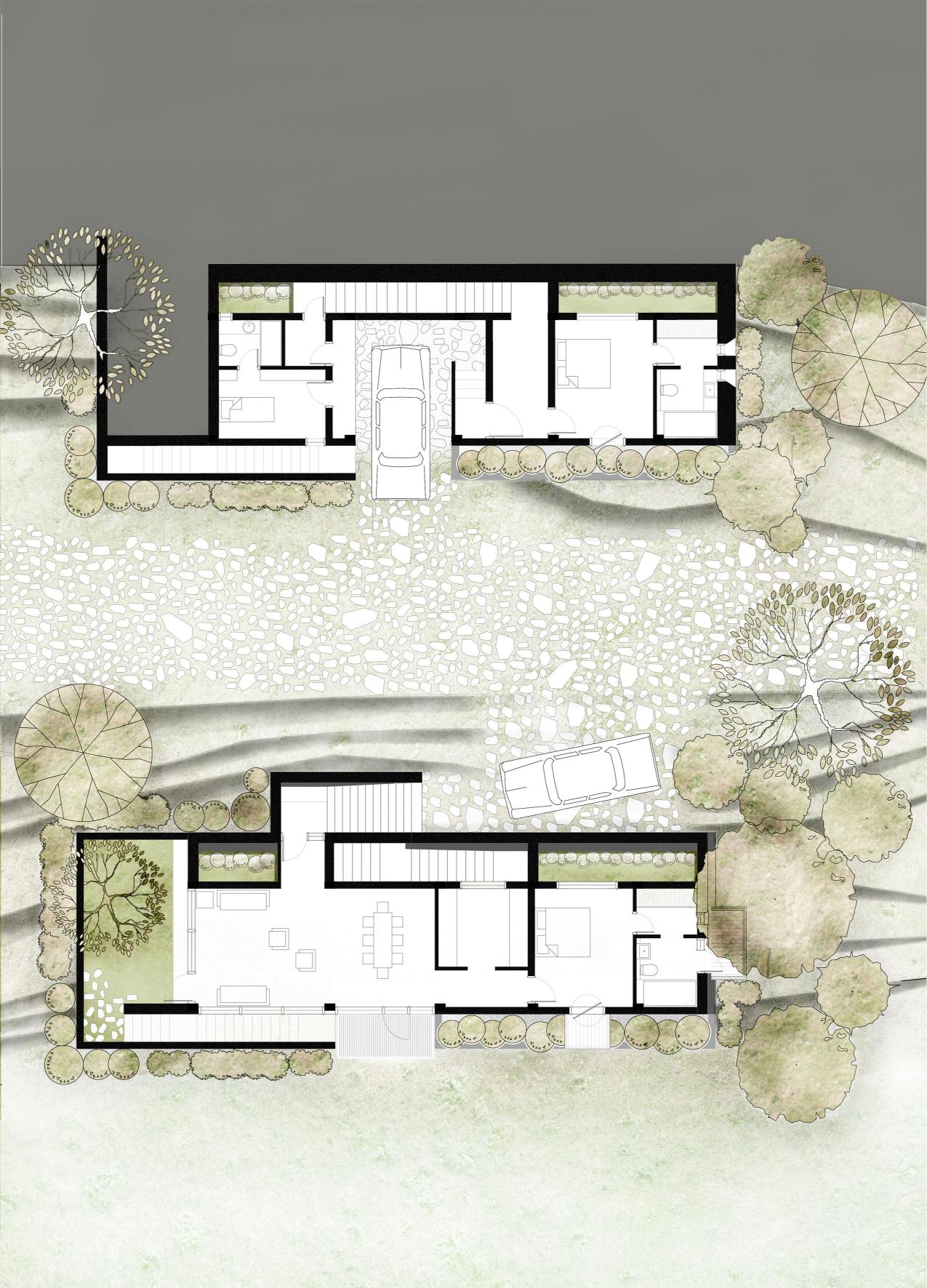 The placement of residences across the levels bestows each home with maximized views of the surrounding natural context & an amplified influx of natural daylight. Each 2 Bedroom residential unit incorporates an expansive living cum dining area & a linear staircase which acts as a light core that softly illuminates the living spaces. Each independent residence has been demarcated at the site level by creating a niche for the built structure, bordered by a retaining wall, a private landscaped lush garden & a dedicated vehicular parking spot. The retention walls bordering the site’s boundaries act as catchment areas for the rainfall water.