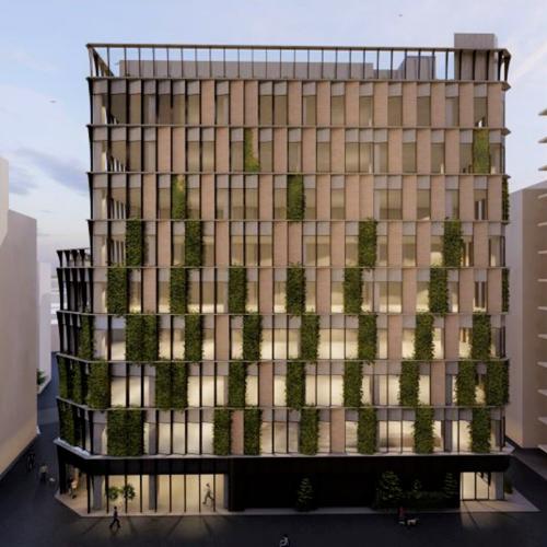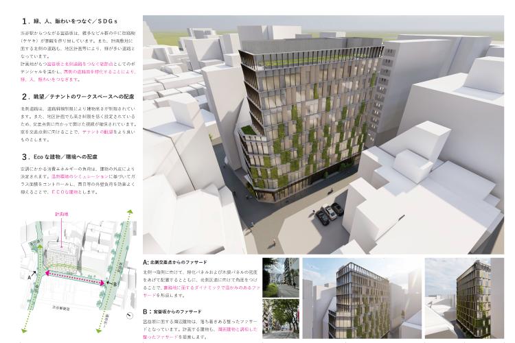 本計画は、渋谷駅から連続するケヤキ並木が印象的な宮益坂と、ストリートカルチャーを発信する北側道路を結ぶ結節点としての立地ポテンシャルに着目し、異なる性格をもつ二つの街路環境をつなぐ都市的な媒介装置となる建築を目指した。周辺は雑多な建物群の中に街路樹が景観の軸を形成しており、計画ではその連続性を立体的に拡張するため、西側道路面を中心に積極的な緑化を行い、緑・人・賑わいを建築スケールで接続するファサードを構成している。