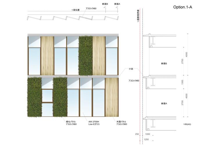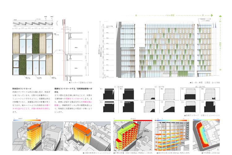 また、北側道路は高さ制限により視線の抜けが確保されていることから、開口部の向きと配置を最適化し、テナントワークスペースから交差点方向への眺望が得られる計画とした。さらに、温熱環境シミュレーションに基づいてガラス面積と外皮構成を調整し、西日による熱負荷の大きい上層部には遮熱性能の高い外装パネルを採用することで、環境性能と執務快適性を両立させている。都市的な接続性、景観的連続性、環境配慮を統合した建築提案である。