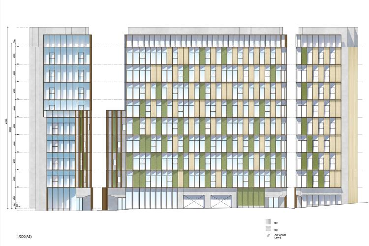 外装計画では、北側から南側に向かって緑化パネル、アートパネル、木調パネルの密度を段階的に高めるグラデーション構成を採用するとともに、北側区道に対して外装面に角度変化を与えることで、裏路地的なスケール感を受け止めながら、動きと奥行きを感じさせるダイナミックで温かみのある表情をつくり出した。一方で宮益坂側については、周辺建物の整った街並みに呼応する落ち着いた構成とし、街路ごとのキャラクターに応答する二面的なファサードデザインとしている。