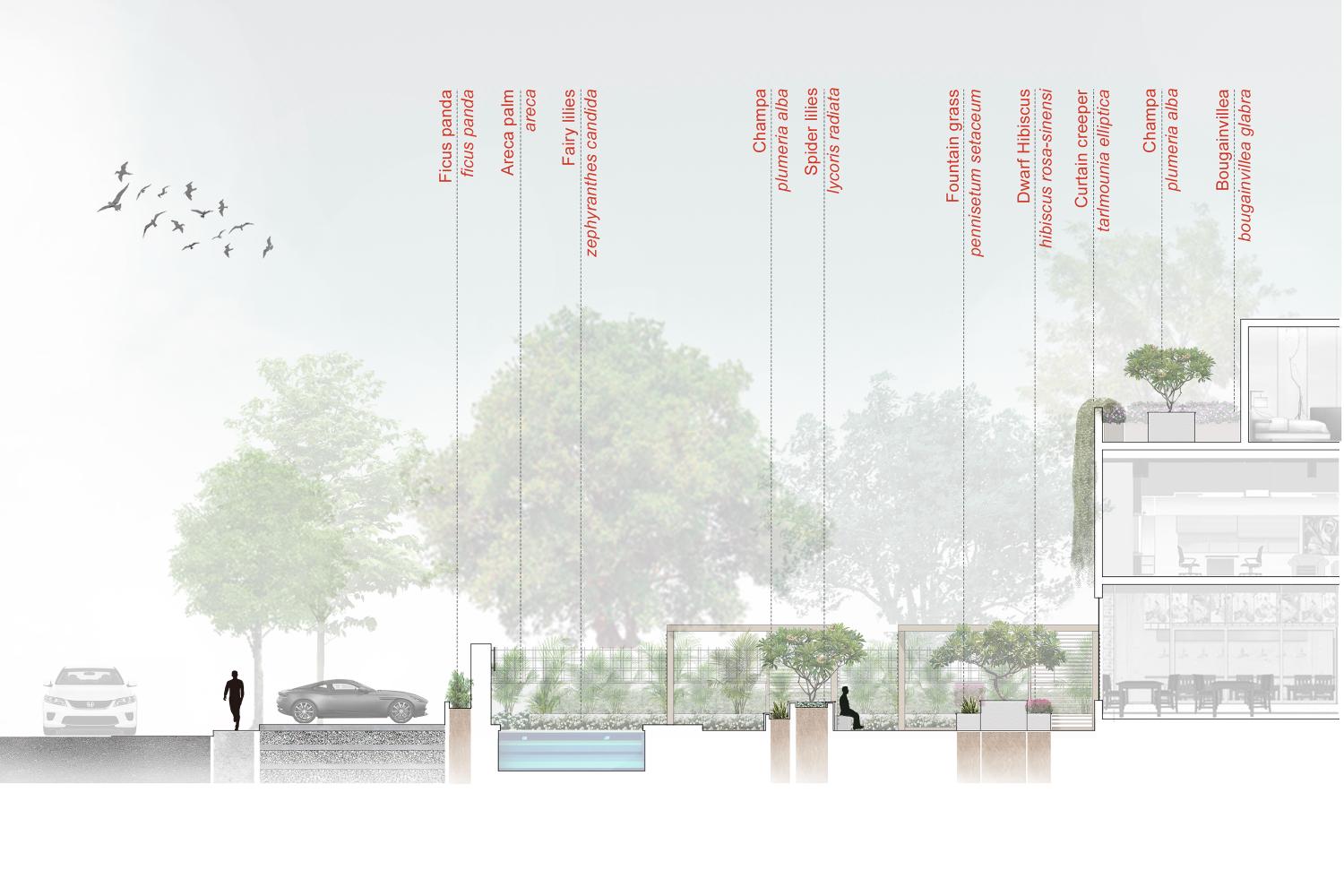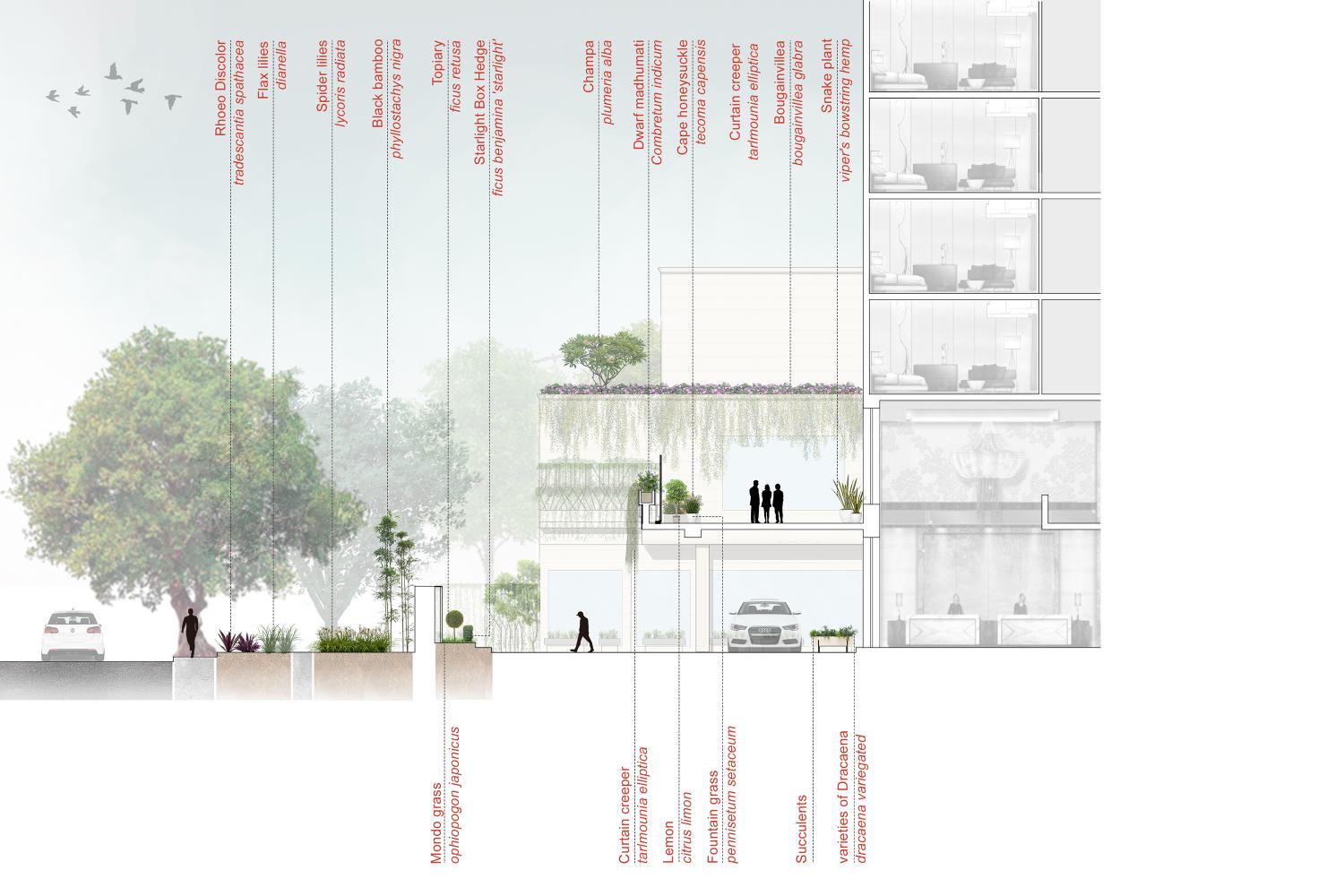 The hotel sits on a tight lot, with not much ground to design a sprawling garden. As a result, our strategy was to elevate the sense of green by incorporating planting at various levels. Our site doesn’t boast of expansive landscape views, but instead highly curated garden experiences as created as the user traverses through various pockets of the building. Starting from the front boundary, the planting is done in layers with each row of planting increasing in height The entry drop off porch has a bold chevron pattern in steel grey granite, through playing up the texture, complemented by a curtain creeper falling from the terrace above.